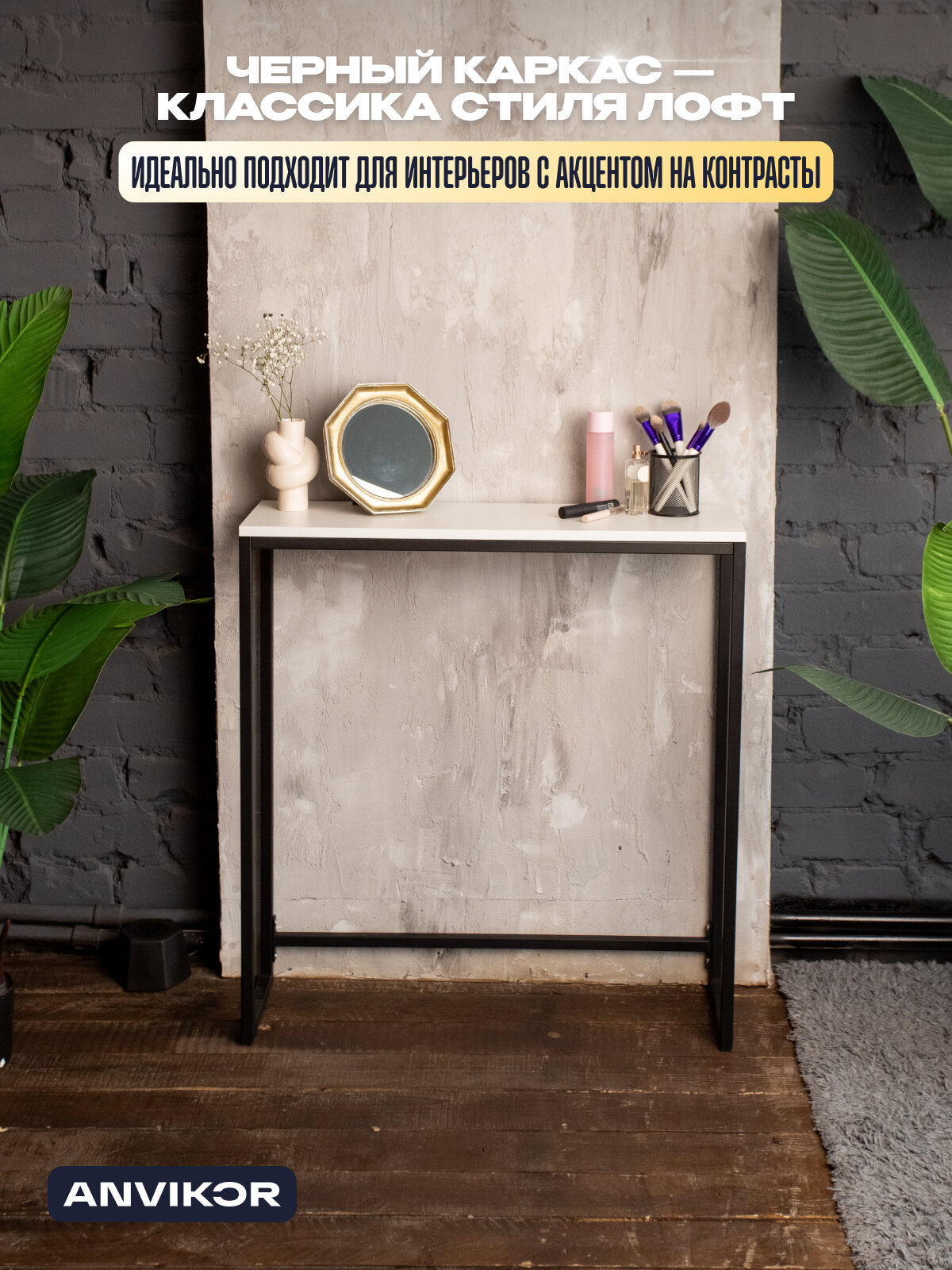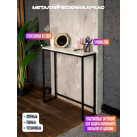 Консольный туалетный столик «Шели» с черным металлическим каркасом — классика стиля лофт. Столик станет не только практичным элементом, но и стильным акцентом в вашем доме. Узкая столешница позволяет разместить изделие в компактных прихожих, коридорах и гостиных, при этом не загромождая их.