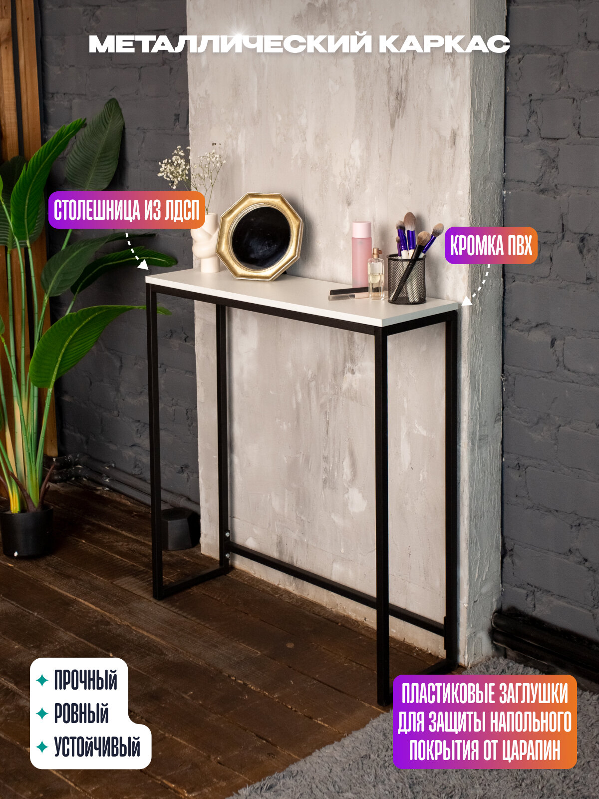 В гостиной консольный столик станет отличным местом для размещения книг, журналов или аксессуаров, создаст атмосферу уюта и стиля. Прочный металлический каркас обеспечивает надежность и долговечность, что делает его идеальным выбором для активного использования. Благодаря своему ненавязчивому минималистичному дизайну консольный столик легко вписывается в различные стили оформления — от минимализма до эклектики.