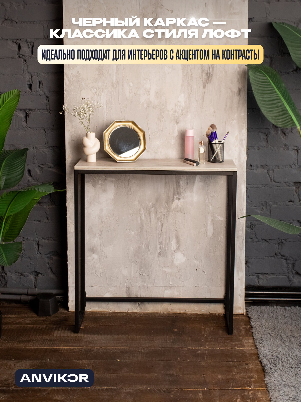 Консольный туалетный столик «Шели» с черным металлическим каркасом — классика стиля лофт. Столик станет не только практичным элементом, но и стильным акцентом в вашем доме. Узкая столешница позволяет разместить изделие в компактных прихожих, коридорах и гостиных, при этом не загромождая их.
