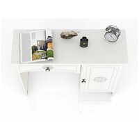 Классический и изящный туалетный столик создаст романтическую обстановку в Вашей спальне. Ширина ниши для пуфика (стула) равна 55 см. Столик оборудован подвесной тумбой и выдвижным ящиком. Расположенная справа тумба дополнена закрытой распашной дверкой и большой нишей с двумя полочками внутри. Столик изготовлен из ламинированной экологически чистой ДСП. Фасады МДФ декорированы специальной фрезеровкой с оригинальным рисунком. Вся мебель поставляется в разобранном виде в отличной паковке и к изделию прилагается комплект фурнитуры, а так же подробная инструкция по сборке.