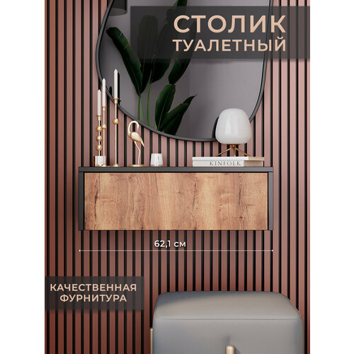 Столик туалетный дуб вотан с чёрной кромкой для Вашего дома. Данная тумбочка самая функциональная мебель в комнате. Тумба подвесная, из нашего ассортимента, это и столик для макияжа и столик в прихожую в одном предмете. Стол туалетный подойдет для дома, для салона красоты, студии или парикмахерской. Гармонично дополнит любой интерьер и придаст новое слово в стиле. Подвесная консоль универсальна для любых целей, используйте её как дамский столик или как прикроватная тумбочка. Имеет очень вместительный выдвижной ящик, с плавно ходящими направляющими (200 мм), что позволяет не создавать шума при открытии и закрытии, хранить одежду или объёмные вещи. Рабочие размеры модели: сам столик ВхШхГ = 20,2 см х 62,1 см х 30,1 см. Размеры ящика ВхШхГ = 10 см. х 52 см. х 23,5 см. Удобный косметический столик для хранения духов, косметики, женских аксессуаров и создания макияжа, так что, приобретая макияжный столик Вы можете сделать отличный подарок маме, жене, бабушке, дочке. Размещая как мебель для детской комнаты, тумбочка белая, может служить как подставка под ночник или будильник. Туалетный столик трюмо применима как тумба в коридор или тумба в прихожую. Можно использовать под зеркалом, что будет смотреться в парикмахерских и барбершопах, т. к. на туалетный столик консоль легко сложить все необходимые аксессуары для работы. Этот вид мебели всё больше и больше приобретает популярность как среди домашнего, так и коммерческого пользования. Благодаря своей конструкции консоль мебельная освобождает напольное пространство, и не скапливает под собой пыль, упрощая при этом уборку. Подвесная тумба изготовлена из лдсп класса е1 и полностью безопасна и экологична. В комплекте есть весь необходимый фурнитур для сборки и инструкция. Наша команда с трепетом относится к нашим клиентам и следит за качеством продукции. Перейдя в магазин «Философия уюта» вы найдете еще больше разнообразной мебели: настенная полка, стеллаж для книг и игрушек, этажерка, органайзер и многое другое в разных цветах! Философия уюта, уют который доступен каждому!