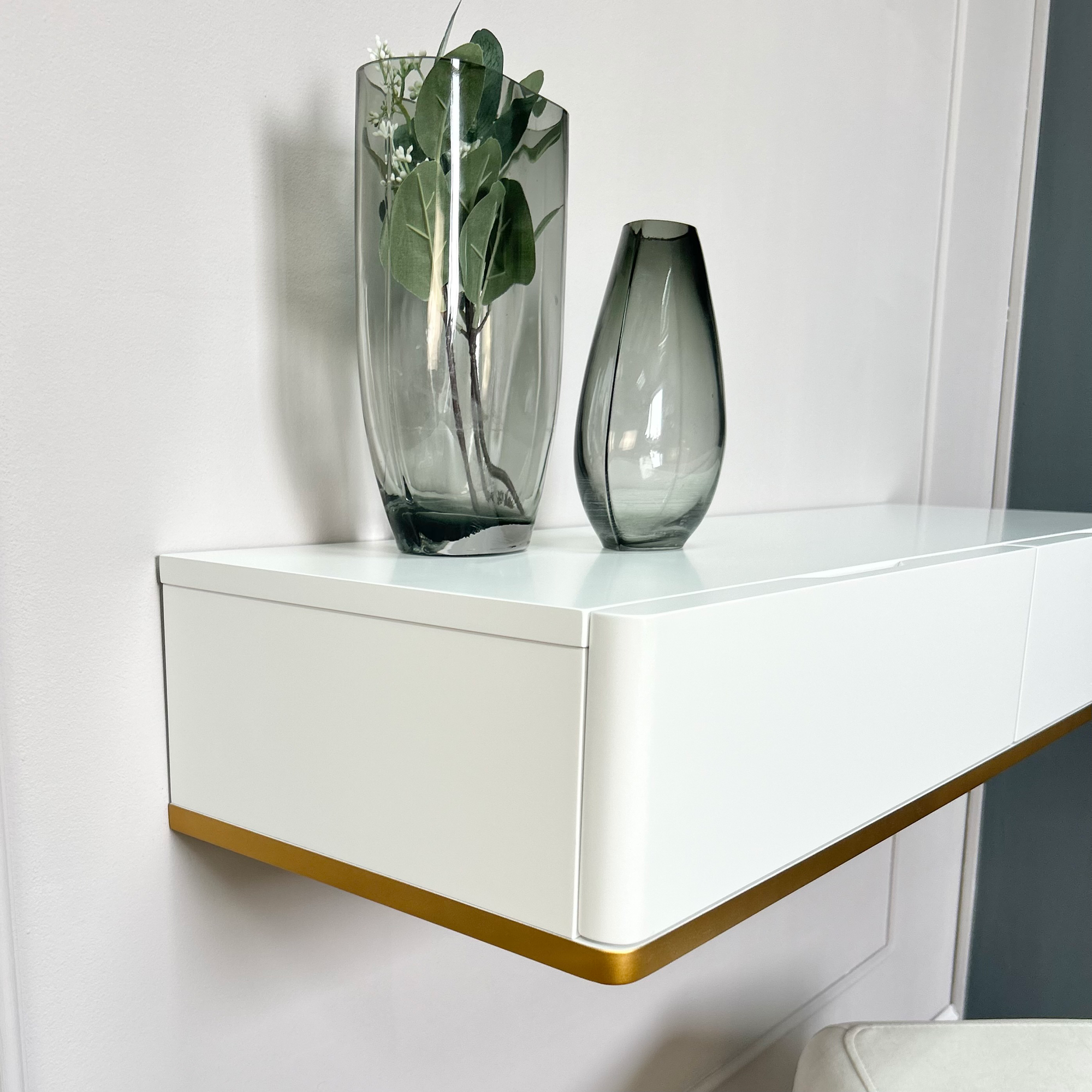 Изготовленный из прочного МДФ и с золотистой вставкой, консольный столик туалетный выглядит стильно и служит надежной основой для хранения. Корпус и фасады стола покрыты белой матовой эмалью RAL 9003, придавая глубокий и насыщенный цвет. Ящики, оснащенные скрытыми направляющими с доводчиками, закрываются плавно и бесшумно, а удобные интегрированные ручки обеспечивают комфортное использование. Это идеальное решение для содержания косметики, принадлежностей для маникюра или других личных вещей, которые важно иметь под рукой, но не на виду. Подвесная тумба настенная является отличным вариантом для спальни и небольших помещений, таких как коридор или детская комната.
