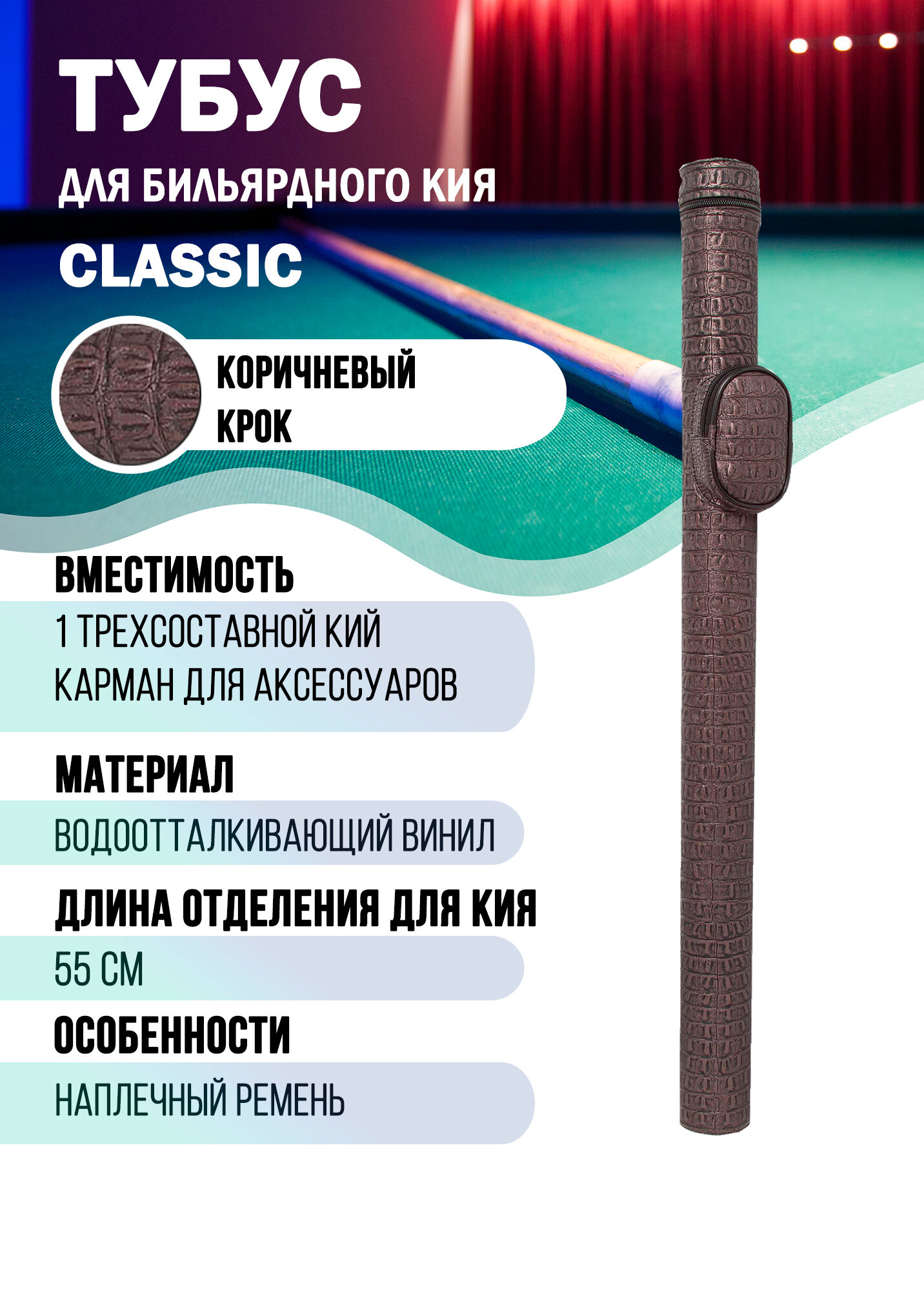 Тубус обладает жесткой конструкцией с наружным покрытием из водоотталкивающего винила. Тубус предназначен для хранения и транспортировки одного трехсоставного кия для русской пирамиды и способен защитить кий от случайных повреждений, от перегрева, пыли и дождя. Тубус открывается и закрывается с торца, застегивается на замок-«молнию». Внутреннее отделение отделано мягкой плотной тканью. Снаружи тубус располагает одним не съемным карманом для аксессуаров. Для переноски тубуса предусмотрен наплечный ремень с регулировкой длины.