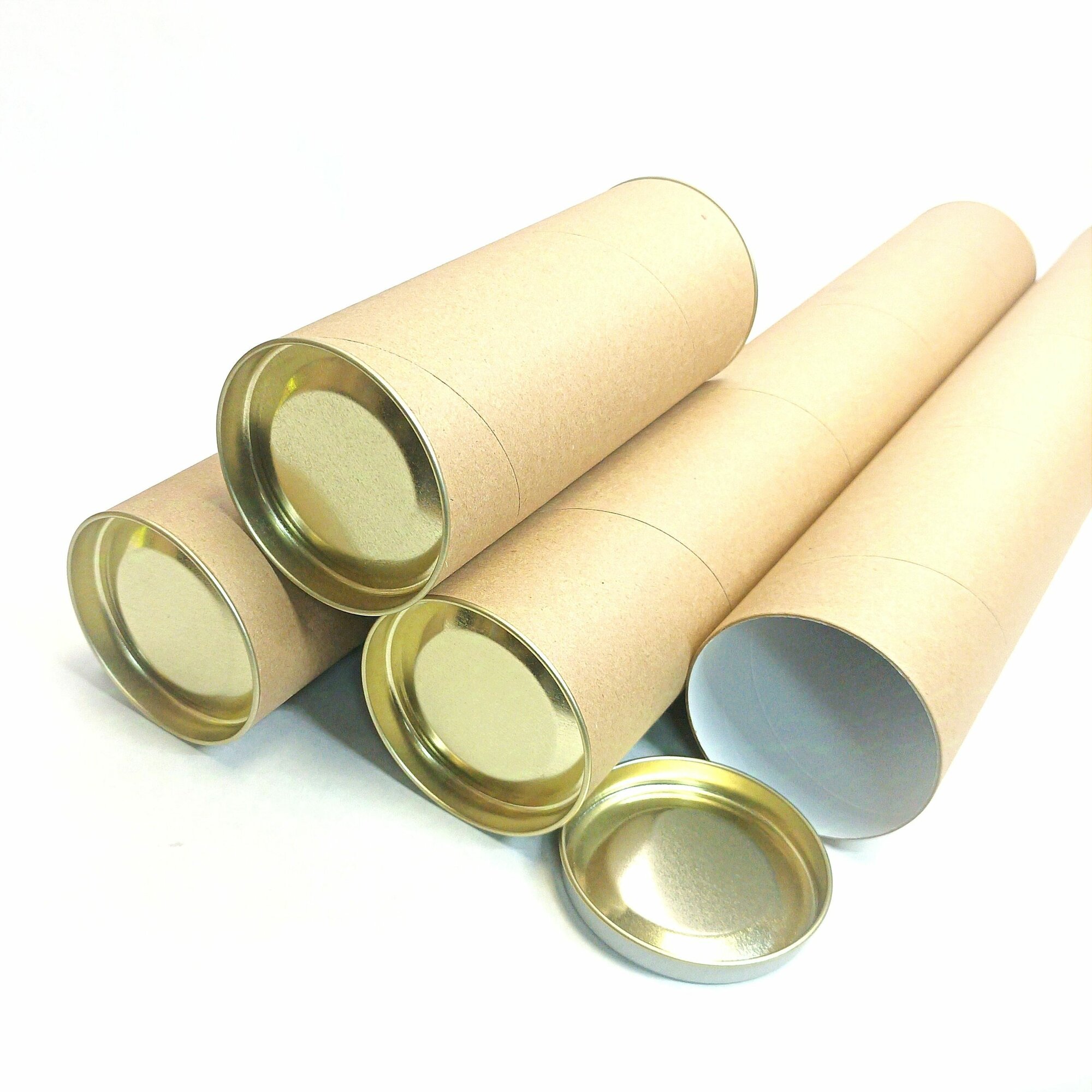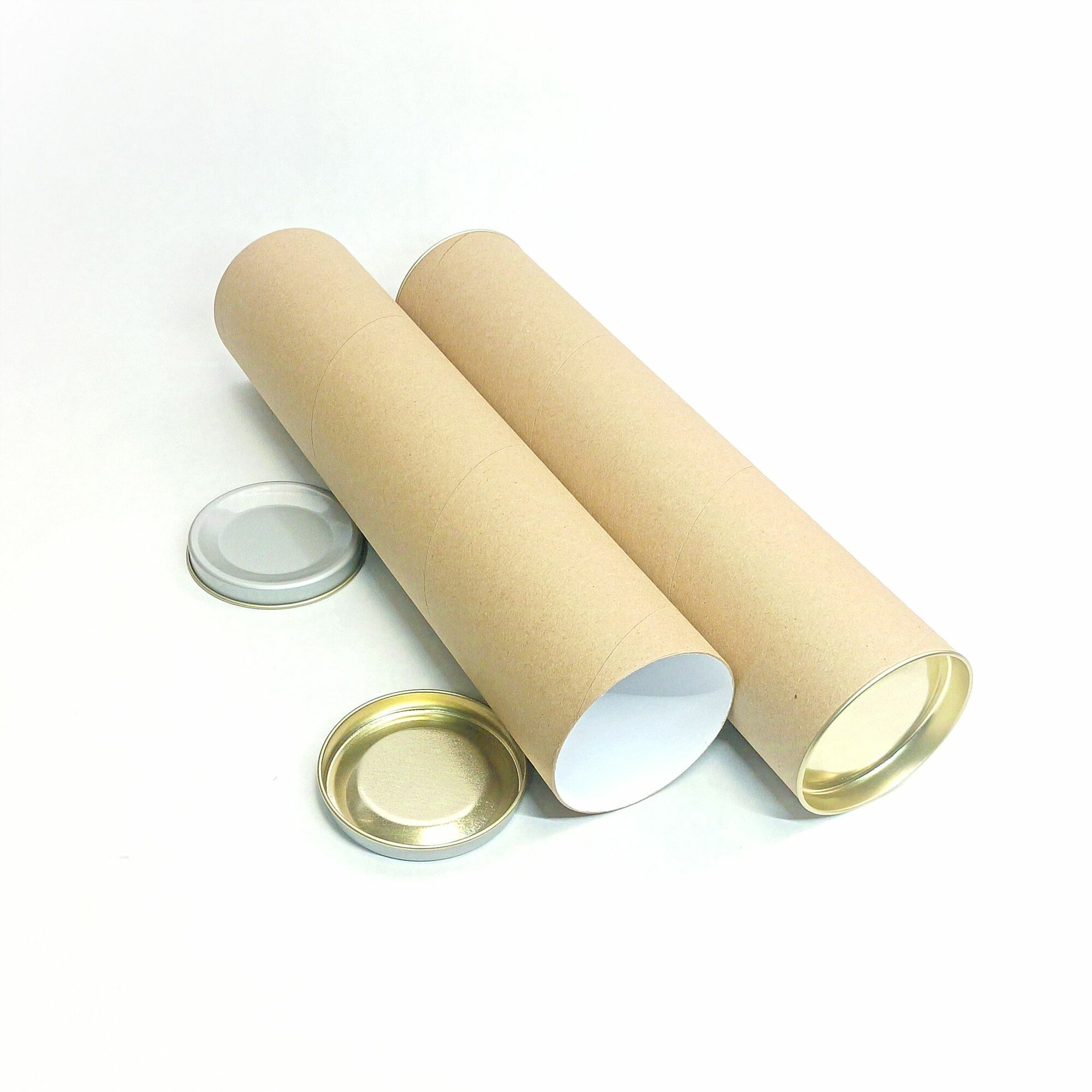 Тубус имеет серо-коричневый цвет крафт бумаги с наружи и белый офсетный слой внутри.