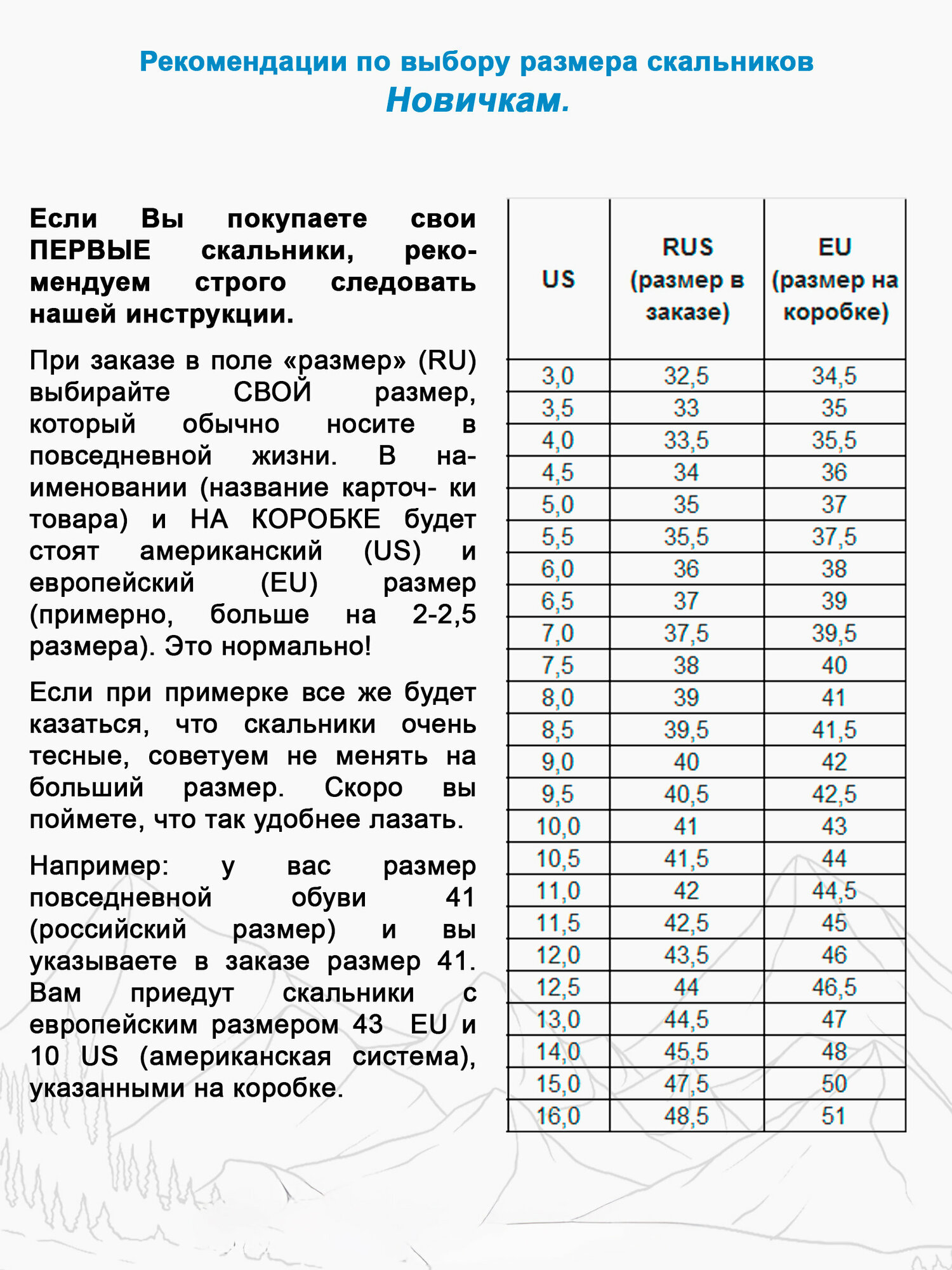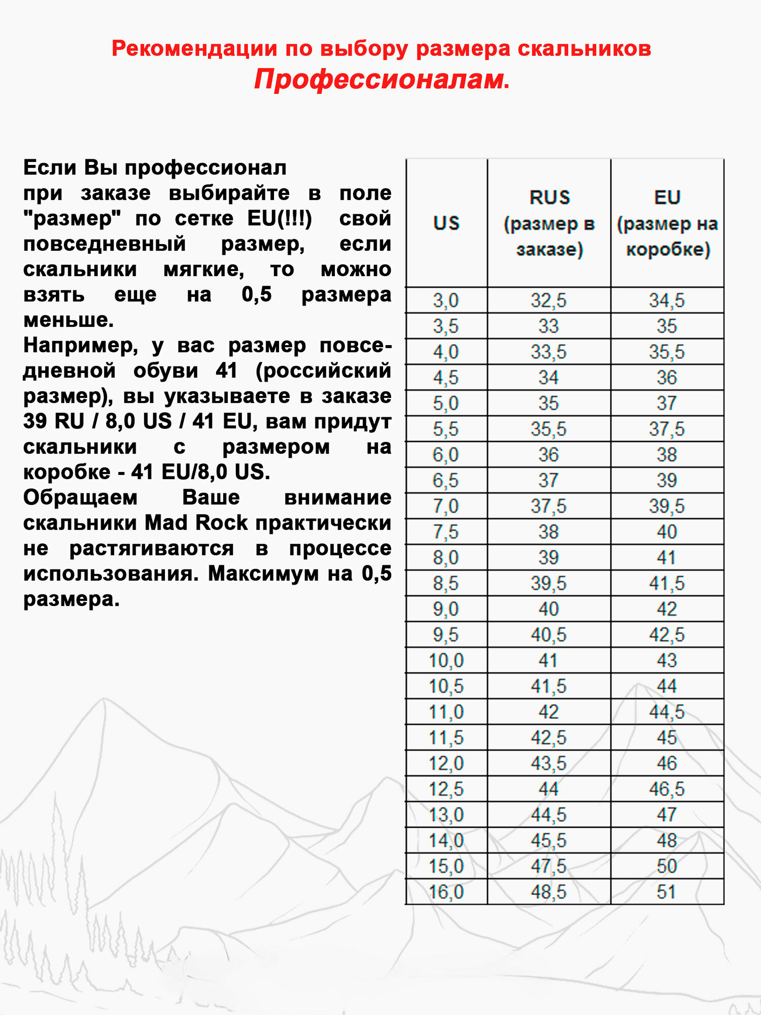 Важно! Отличаются от классической размерной сетки Mad Rock