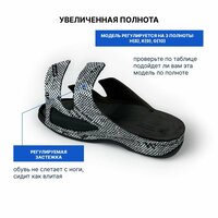 - При выборе обуви правильно подбирайте ее по размеру и полноте с учетом индивидуальных особенностей стопы. Обувь не должна причинять Вам неприятных ощущений, стопа не должна быть сжата. В случае несоответствия размера возможна деформация обуви, расхождение швов, разрыв материала. При надевании расстегните или развяжите все застежки и отрегулируйте их по своей стопе.