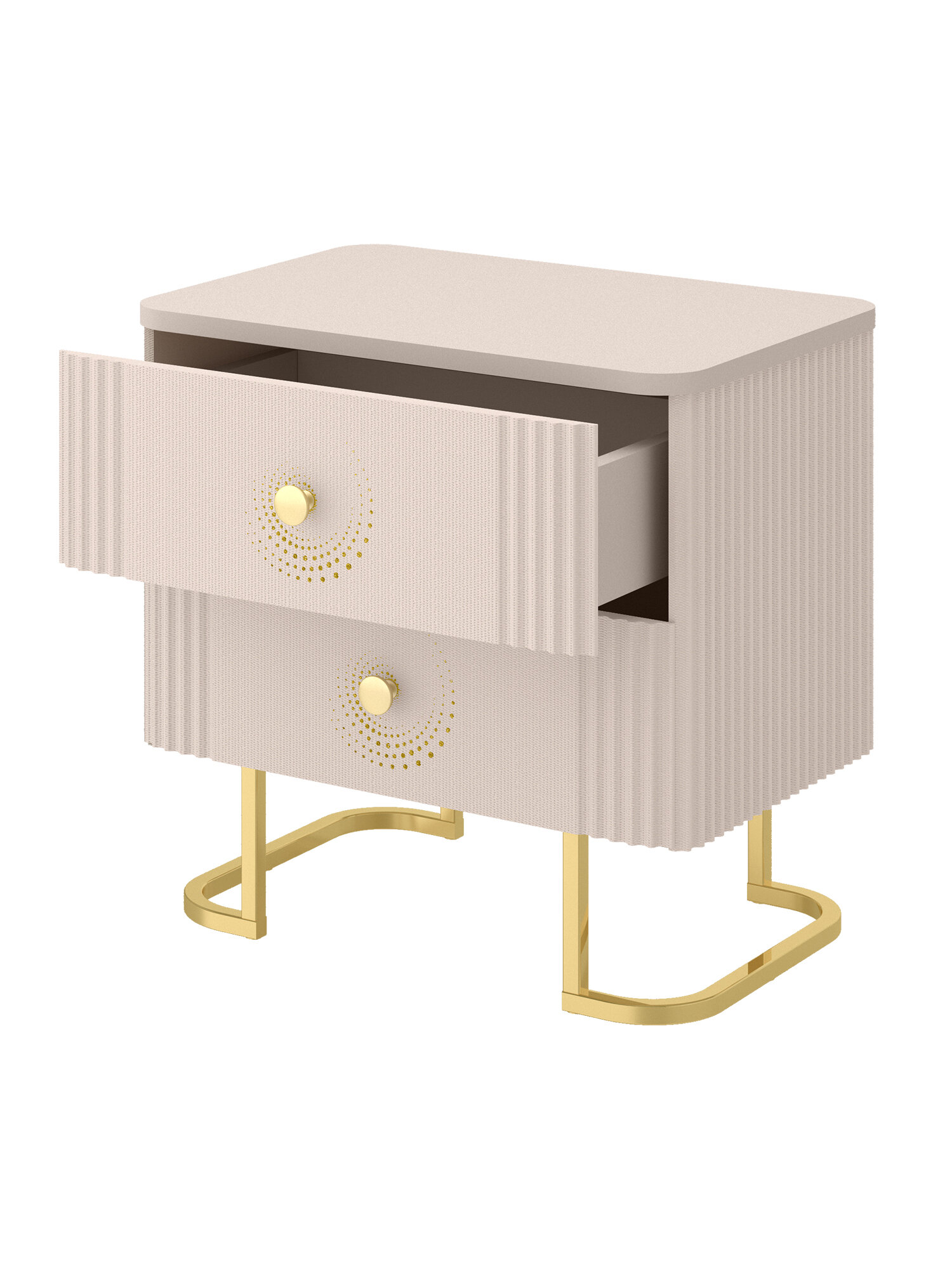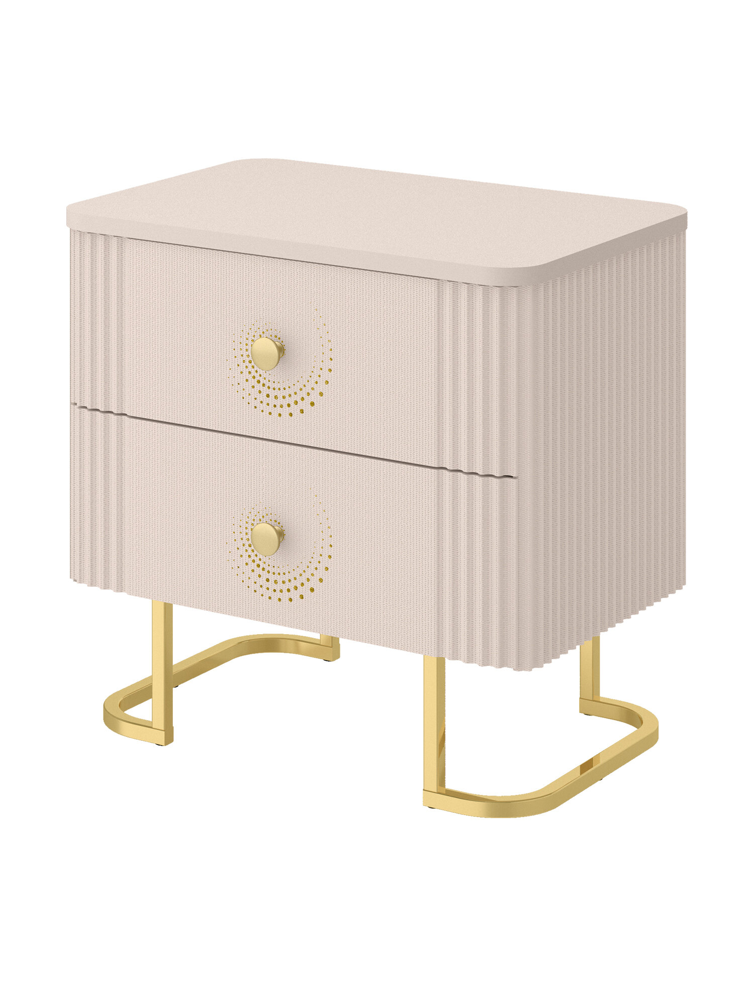 Одной из главных особенностей данной тумбы является мерцающий рисунок на фасаде, который привлекает внимание и создает атмосферу уюта. Изящная ручка в золотом цвете обеспечивает легкое открывание. Оригинальные металлические опоры в цвете золотой глянец придают тумбочке нотку роскоши и современности. Реечный корпус с закруглением добавляет мягкости и гармонии, делает тумбочку прикроватную не только стильной, но и безопасной для использования в спальне.