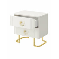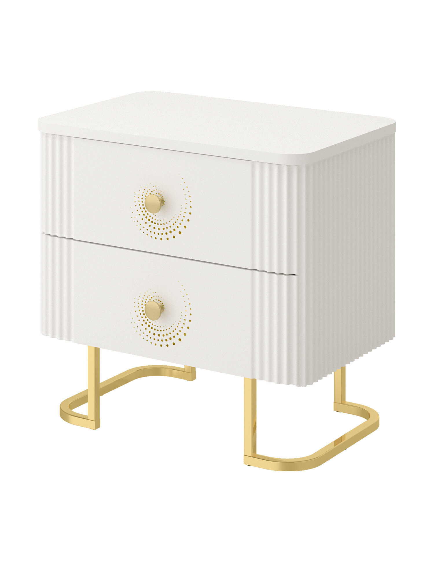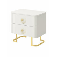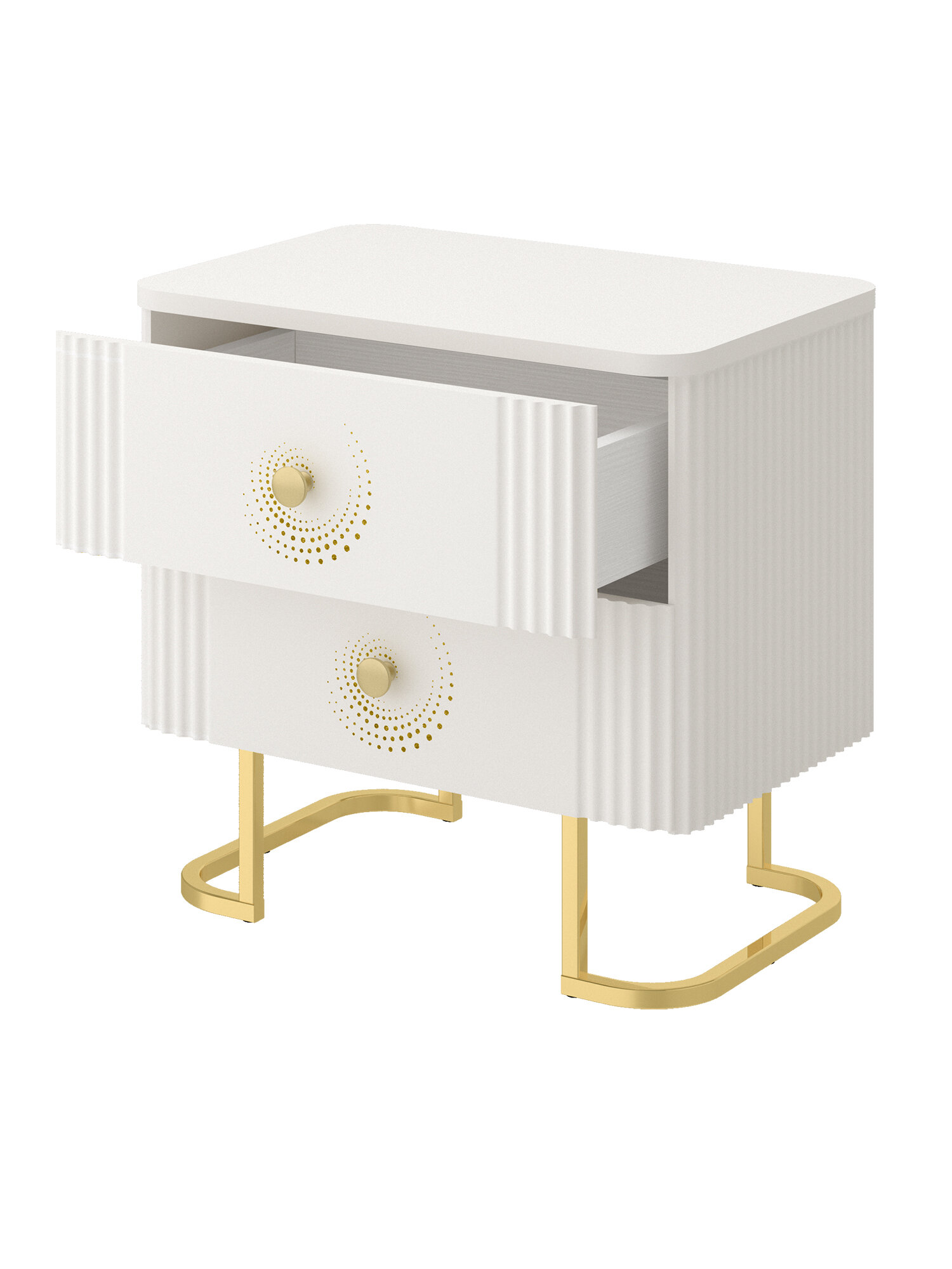 Тумба прикроватная выполнена в теплом белом цвете, в сочетании с роскошными золотыми опорами выглядит гармонично и идеально комбинируется с любой мебелью и аксессуарами. Одной из главных особенностей данной тумбы является мерцающий рисунок на фасаде, который привлекает внимание и создает атмосферу уюта. Изящная ручка в золотом цвете обеспечивает легкое открывание. Оригинальные металлические опоры в цвете золотой глянец придают тумбочке нотку роскоши и современности. Реечный корпус с закруглением добавляет мягкости и гармонии, делает тумбочку прикроватную не только стильной, но и безопасной для использования в спальне.