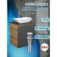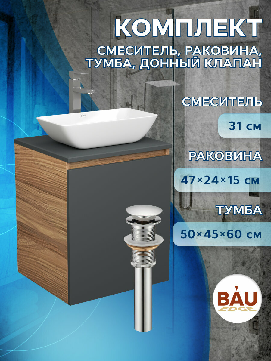 Тумба Bau Dream Blackwood 50 графит, раковина BAU Spectrum mini 47х24 смеситель для раковины высокий Hotel Still, нержавеющая сталь, выпуск клик клак, хром