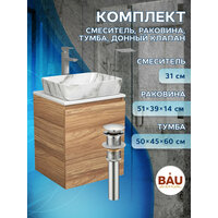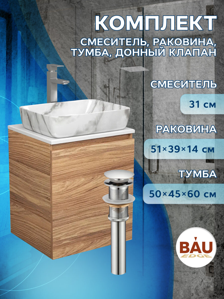 Тумба Bau Dream Blackwood 50 с дверцей, раковина BAU Hotel 51х39, мрамор, смеситель для раковины высокий Hotel Still, нержавеющая сталь, выпуск клик клак, хром