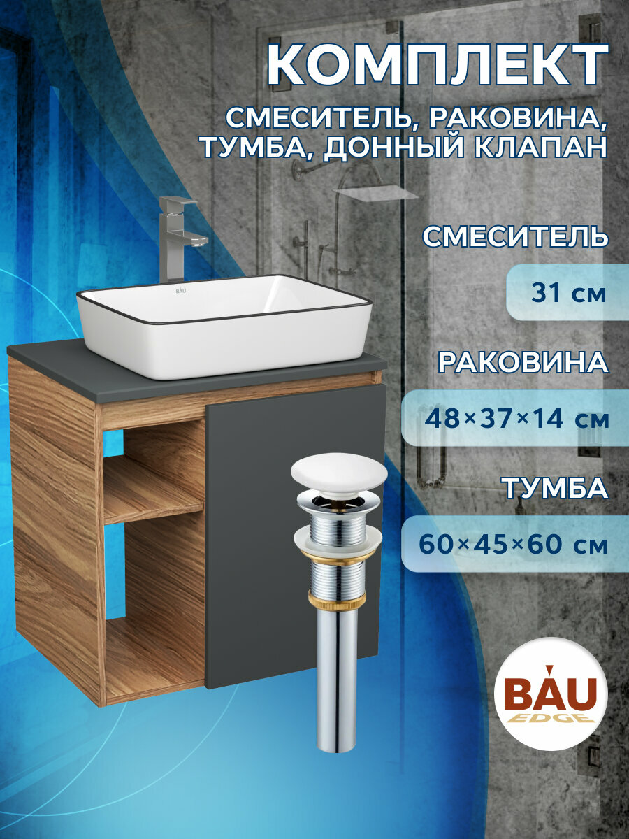 Тумба Bau Dream Blackwood 60 правая, графит, раковина BAU Hotel Black Rand 48х37, смеситель для раковины высокий Hotel Still, нержавеющая сталь, выпуск клик клак, белый