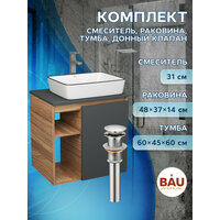 Тумба Bau Dream Blackwood 60 правая, графит, раковина BAU Hotel Black Rand 48х37, смеситель для раковины высокий Hotel Still, нержавеющая сталь, выпуск клик клак, хром