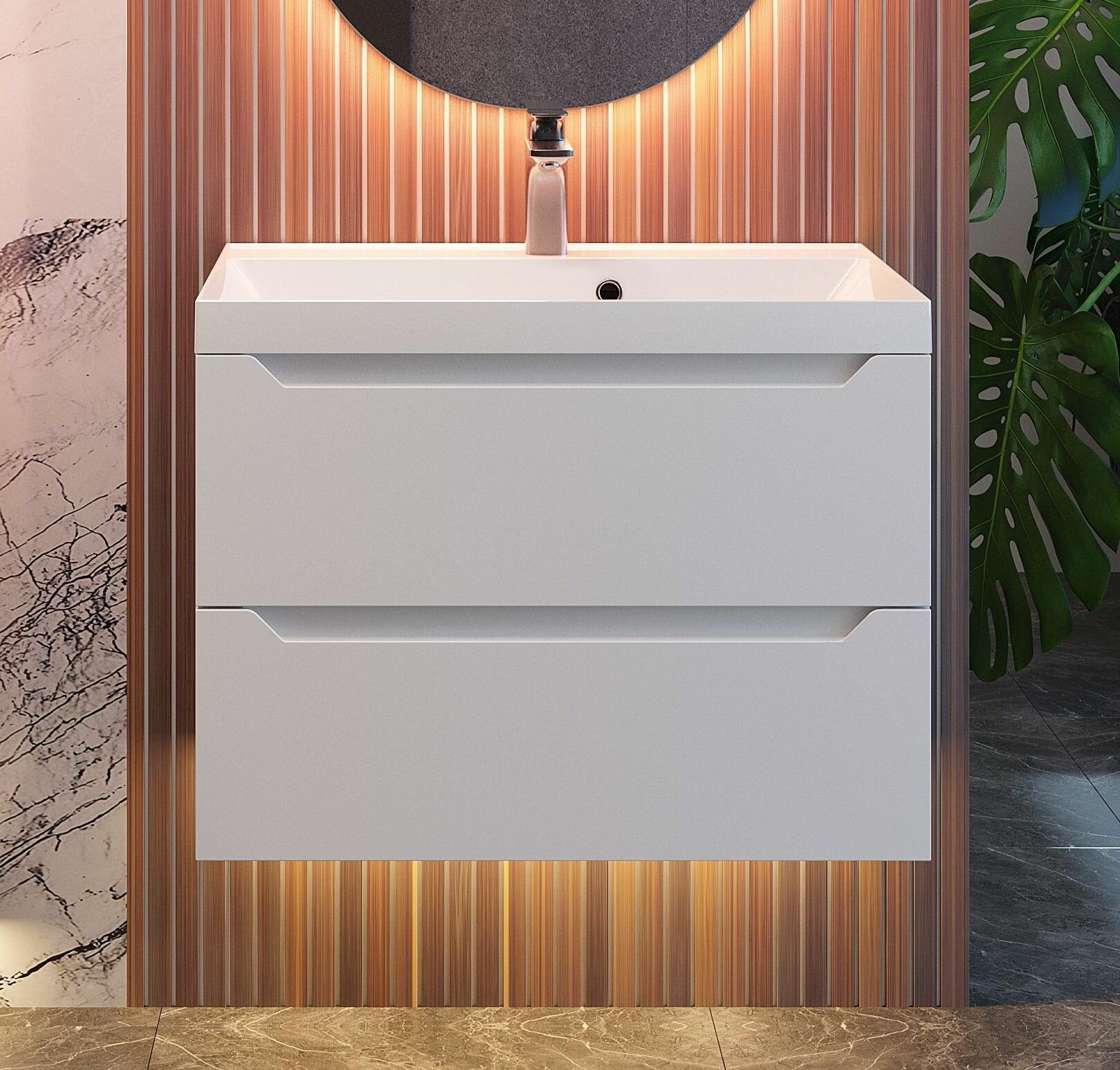 Боковые стороны корпуса и фасад тумбы изготовлены из МДФ "Egger" 19 мм и покрыты пленкой PVC немецких производителей увеличенной толщины, цвет белый матовый Soft-touch (обладает приятным тактильным эффектом при касании и смотрится очень круто!).