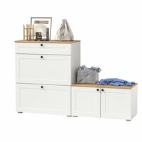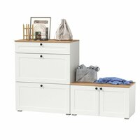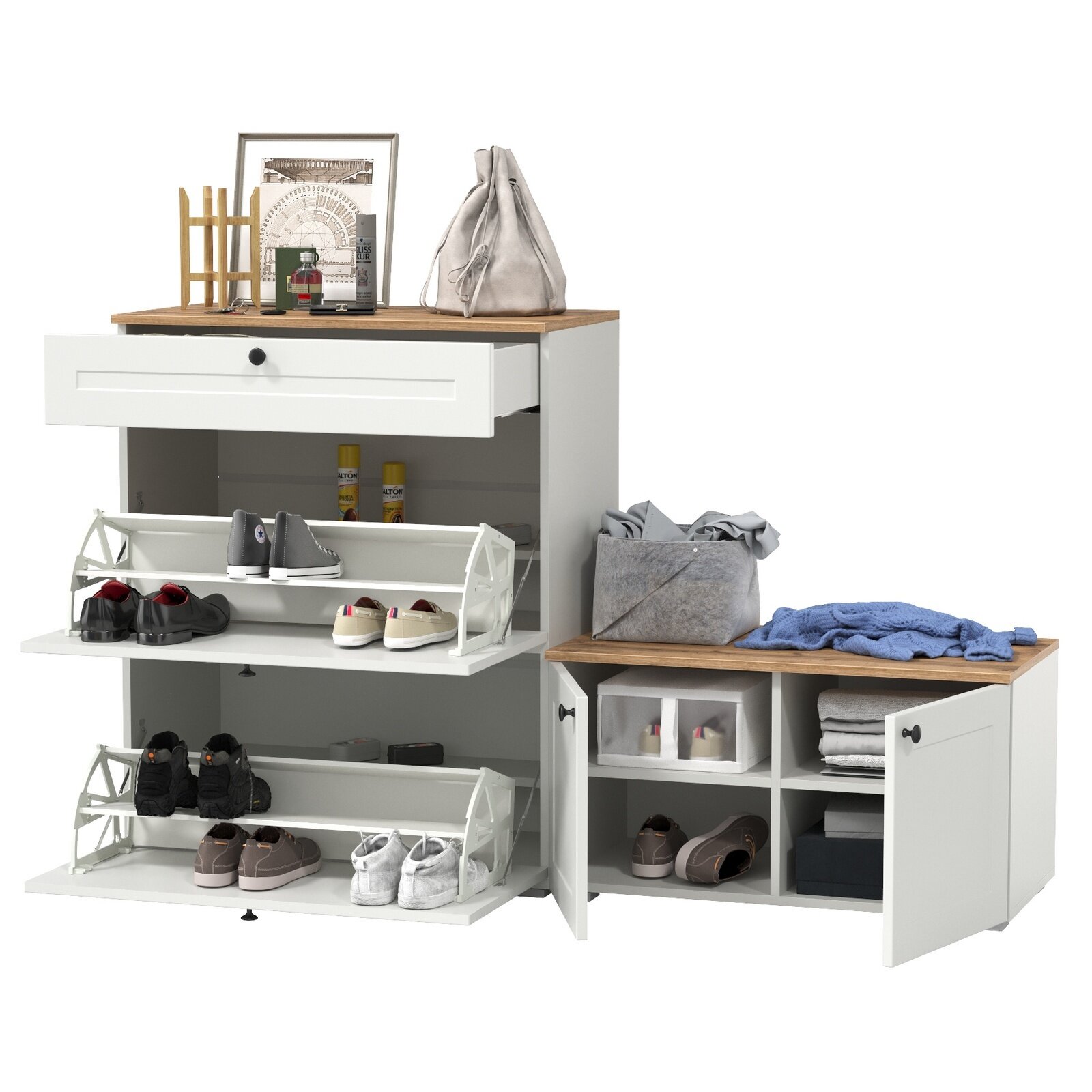 - Тумба с выдвижным ящиком для мелочей сверху и двумя откидными дверками с полками для 12 пар обуви снизу.