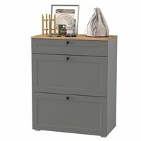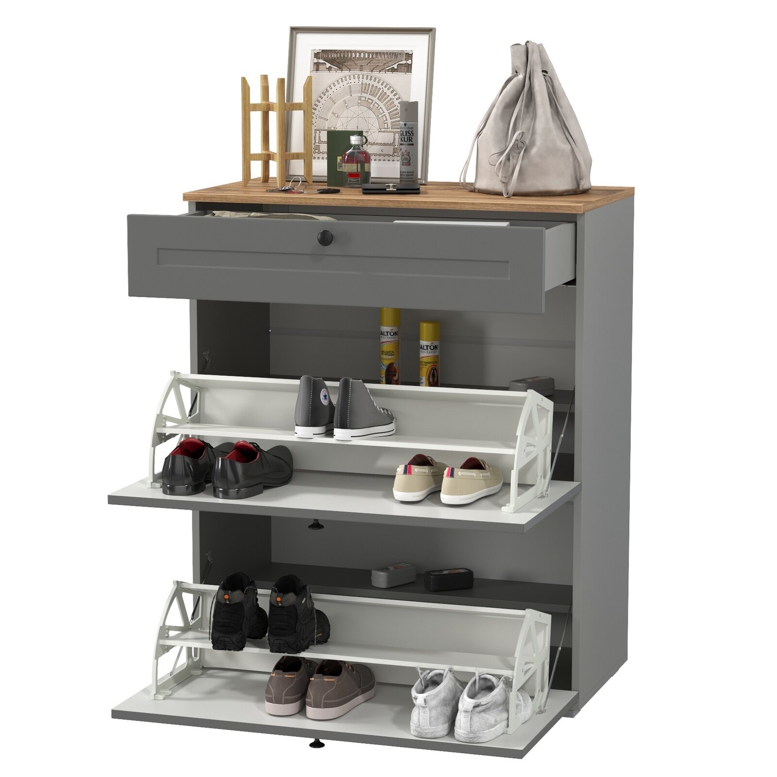 - Тумба с выдвижным ящиком для мелочей сверху и двумя откидными дверками с полками для обуви снизу. Каждая откидная дверь расчитана для хранения и размещения 6 пар невысокой обуви, что обеспечивает удобство и порядок в Вашей прихожей. Максимальная нагрузка на каждую полку и ящик - 3 кг.