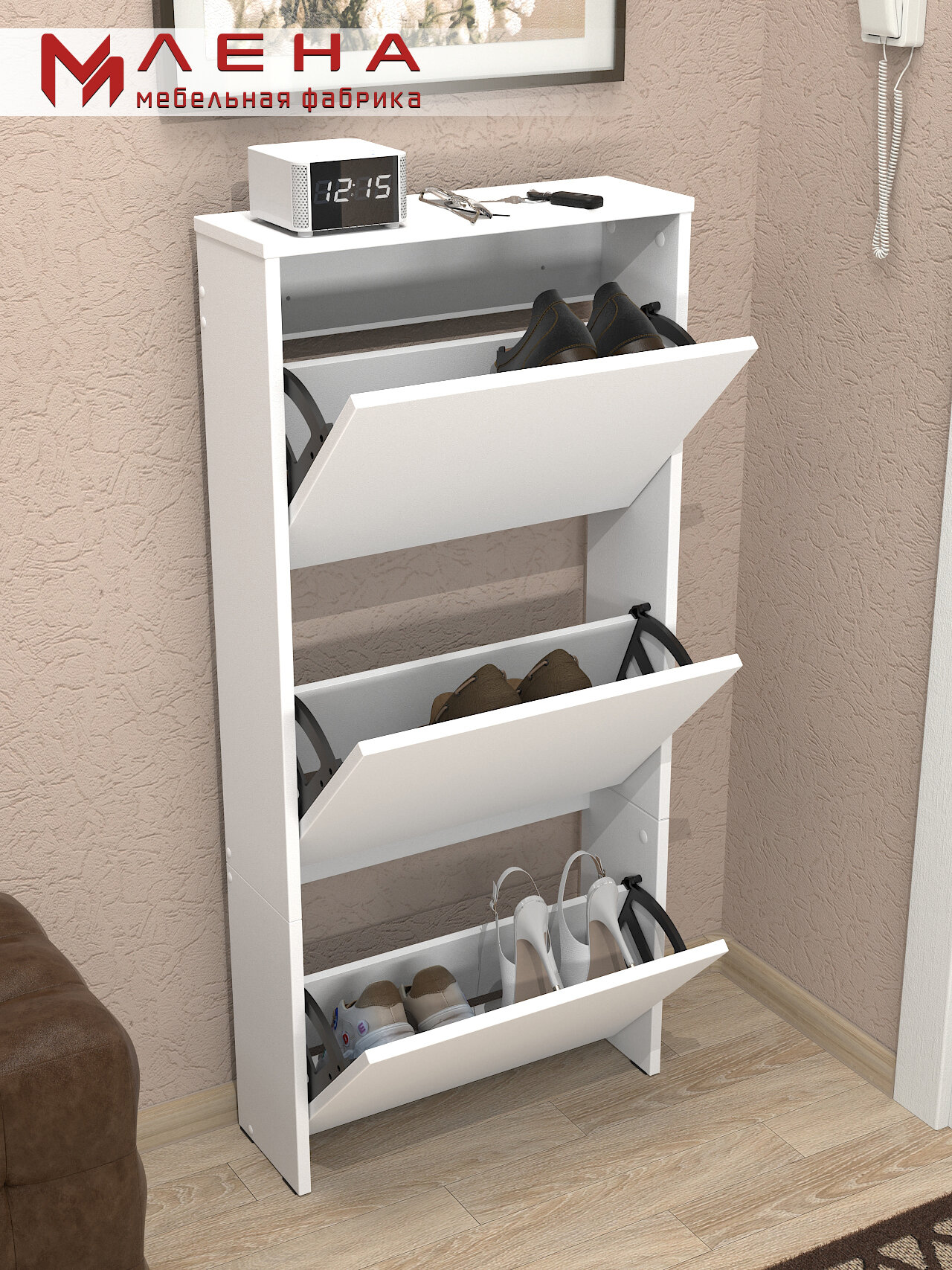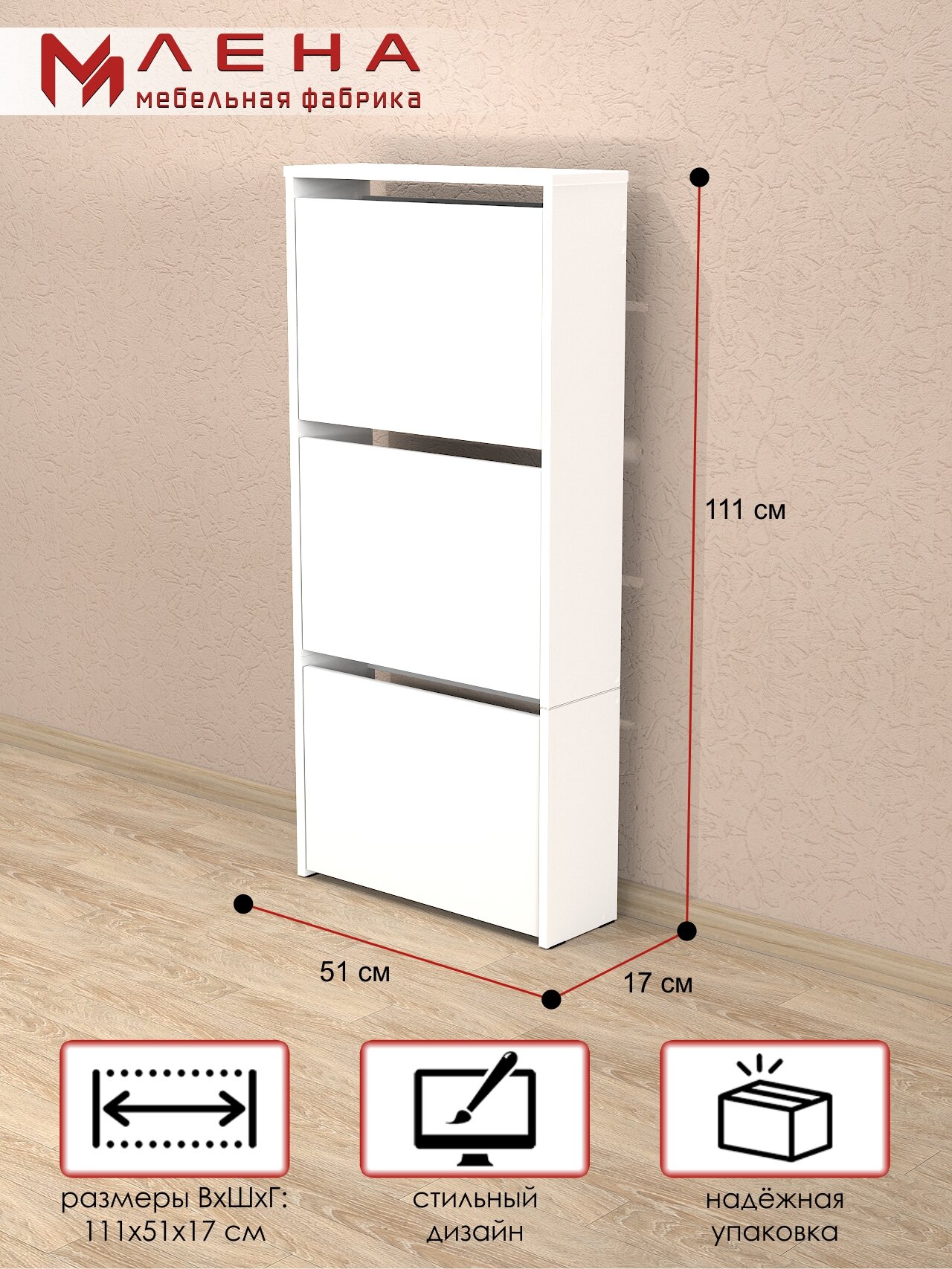 Высокая узкая обувница с откидными дверцами - идеальное решение для хранения обуви в ограниченном пространстве. Этот стильный и функциональный предмет мебели поможет организовать хранение вашей обуви, не занимая много места. Обувница оснащена откидными дверцами, что обеспечивает легкий доступ к вашей обуви и позволяет эффективно использовать вертикальное пространство. Высокое качество материалов и прочная конструкция обувницы гарантируют долгий срок службы. Этот функциональный и стильный предмет мебели будет отличным дополнением к любому интерьеру и поможет поддерживать порядок в вашем доме. Приобретите высокую узкую обувницу с откидными дверцами и наслаждайтесь удобством хранения вашей обуви! Корпус и фасад тумбочки под обувь изготовлены из качественной ЛДСП 16мм 1 класса "Kronospan". Видимые торцы обувницы оклеены кромкой ПВХ, толщиной 2мм. Будем благодарны, если после покупки вы оставите нам отзыв! Мы как прямые производители мебели гарантируем вам высокое качество товара. Вся продукция сертифицирована.