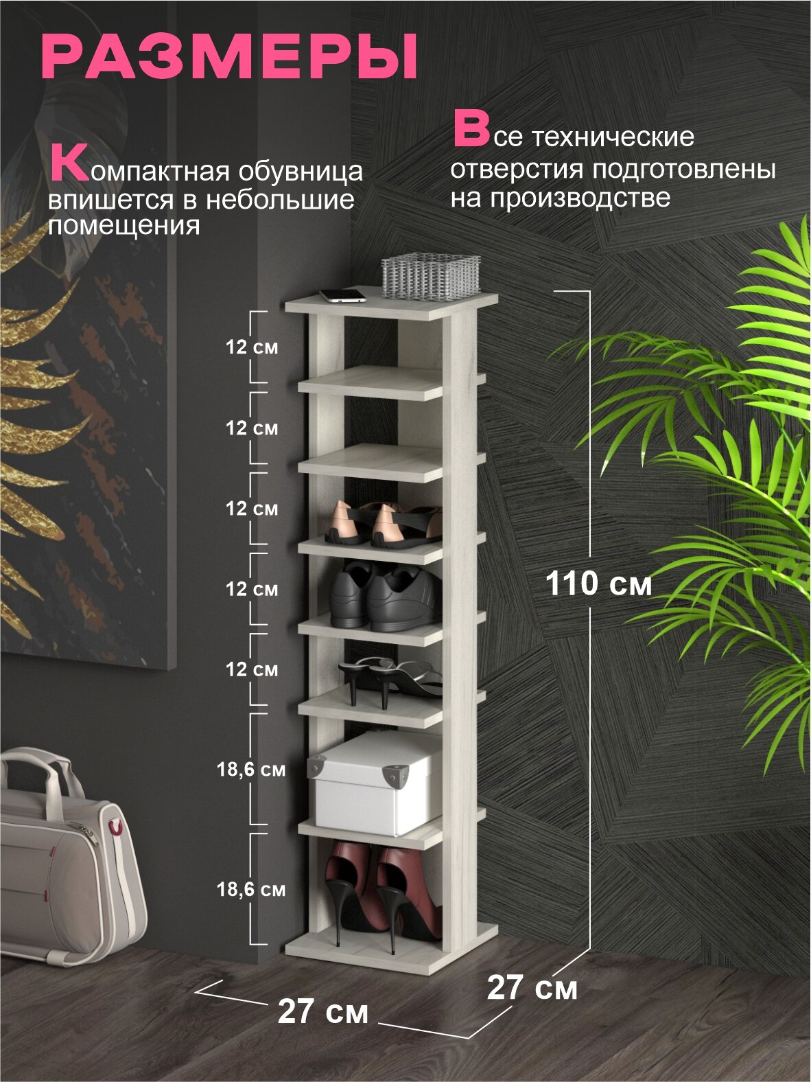 Компактные размеры (110х27х27 см) позволяют разместить обувницу в помещениях с ограниченным пространством. У этажерки семь полок, две для сапог и пять для низкой обуви. Такой стеллаж для обуви отлично подходит не только для дома, но и для дачи или даже офиса. Легкий доступ к вашим любимым туфлям и ботинкам делает повседневное использование комфортным и удобным.