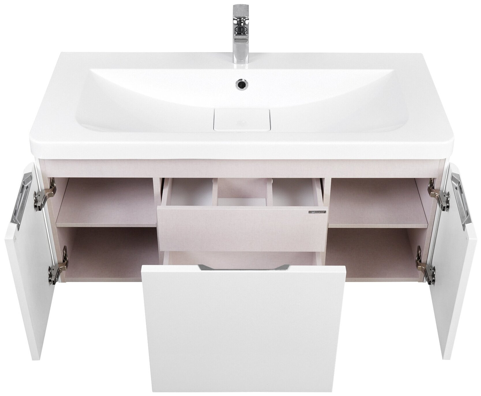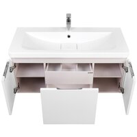 Подвесная тумба под раковину Шерилл 105 от AQUATON отражает современное понимание удобства и комфорта в ванной комнате. Модель сочетает в себе стильный лаконичный дизайн и безупречное исполнение. Корпус из влагостойкой ЛДСП и фасады из МДФ покрыты белой глянцевой краской ультрафиолетового отверждения. Плавные линии, присутствующие в каждом элементе, делают её легкой и воздушной. Скругленные углы и ручки, встроенные в фасады, делают тумбу безопасной, а продуманный функционал и система внутренней организации - удобной. Модель включает двустенный ящик полного выдвижения с системой плавного закрывания, внутренний ящик с системой push-to-open, а за боковыми распашными фасадами находятся дополнительные отсеки с полками. Таким образом, каждая вещь будет на своем месте.
