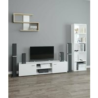 Тумба под телевизор светлая выполнена в белом цвете шагрень, что придает ей современный и элегантный вид. Корпус и фасад тумбы изготовлены из качественного ламинированного ДСП, что обеспечивает долговечность и устойчивость к повреждениям.