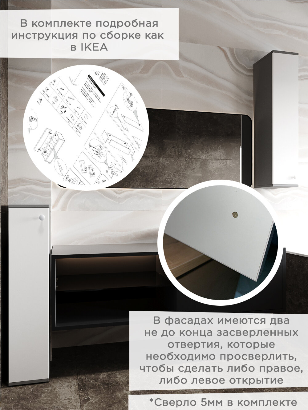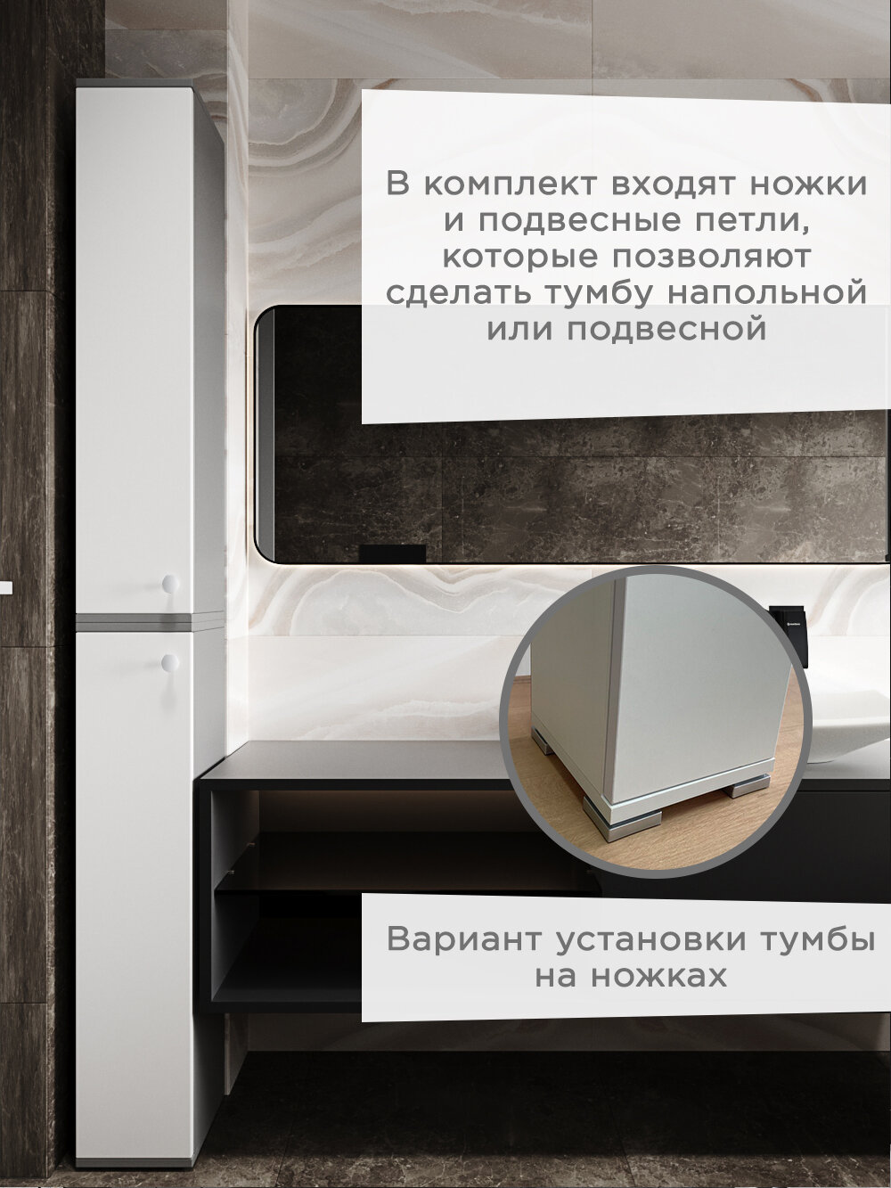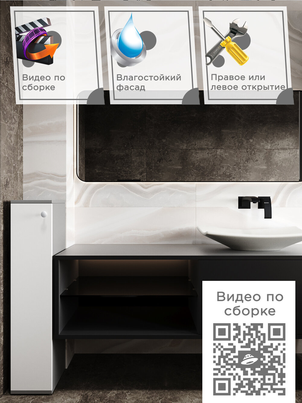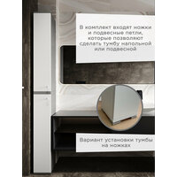 Узкий шкаф с универсальным открытием! Вы можете сделать открытие как правым, так и левым, прикрутив ручку в необходимое отверстие. Данный шкаф для ванной комнаты и туалета мы специально разработали для небольших помещений. Габариты тумбы позволяют вписать его в ограниченные пространства. Также возможность использовать как подвесной шкаф (в комплекте подвесные кронштейны), делает данную тумбу более практичной. В туалете шкафчик отлично встанет рядом с унитазом. Тумба в ванную может стоять рядом со стиральной машинкой или как подвесная консоль может быть установлена рядом с зеркалом или раковиной. Также шкафчик можно использовать как интерьерную тумбу в прихожей или коридоре, для ключей и разной необходимой мелочи. Тумба выполнена из сертифицированных материалов. Фасад изготовлен из качественного влагостойкого материала. Мы ценим время наших покупателей, поэтому создали подробную видеоинструкцию по сборке (смотреть фото). Благодаря дополнительным отверстиям вы можете установить полкодержатели с полками на тех высотах, где вам комфортно. Мы также большое внимание уделяем упаковке. Содержимое со всех шести сторон упаковано в коробку из пятислойного гофрокартона, а так же в пенопласт. Но если всё-таки заказ пришел к Вам с повреждениями, то не снижайте нам оценку, потому что в этом виноваты не мы, а служба доставки WB. Лучше сделайте возврат с пометкой брак, что бы вернулось нам, а не отправилась другому покупателю. Вы же знаете как обидно получать негативный отзыв за то, в чём ты не виноват, особенно когда мы, правда, очень стараемся!))