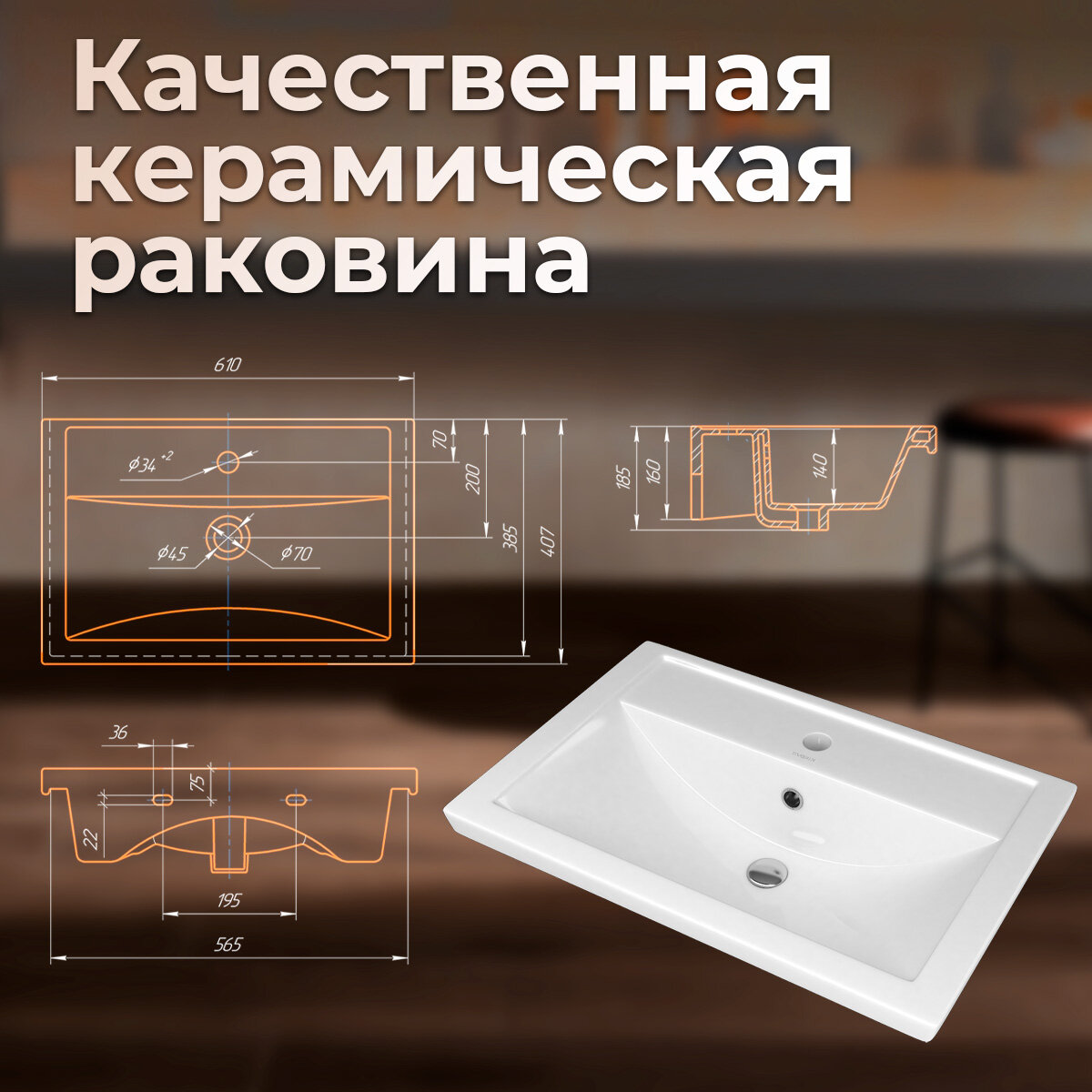 Размеры тумбы составляют 56 см в ширину, 50 см в высоту и 38 см в глубину. Размеры раковины – 60 см в ширину и 40 см в глубину.