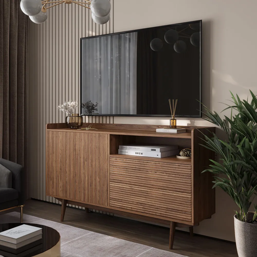 Тумба для телевизора с утонченным реечным дизайном и механизмом push-to-open представляет собой идеальное решение для вашего интерьера. Спроектирована для телевизоров до 65 дюймов и выдерживает максимальную нагрузку до 100 кг, она обеспечит надежную поддержку вашему аппарату. Ножки из натурального дерева придают тумбе особый шарм и стабильность.
