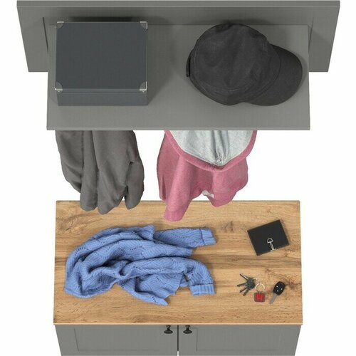 - За распашными дверками тумбы находятся два отделения, в каждом из которых имеются полки, расположенные по центру. В тумбе предусмотрены съемные полки, которые можно использовать специально для высокой обуви, обеспечивая удобное и оптимальное распределение.