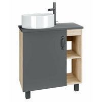 В тумбе Флай 70 см сочетаются контрастные цвета и фактуры: серый матовый фасад с покрытием SoftTouch, корпус цвета дуба с текстурой, черная матовая фурнитура. Открытые полки справа обеспечивают быстрый доступ к аксессуарам, а пространство за распашной дверцей, снабженной системой плавного закрывания, станет удобным местом для хранения бытовых принадлежностей. Корпус тумбы выполнен из ЛДСП, фасад - из МДФ в матовой пленке, перепадам температур и высокой влажности. Черная металлическая ручка и 4 ножки (2 декоративных черных и 2 пластиковых) идут в комплекте с тумбой.