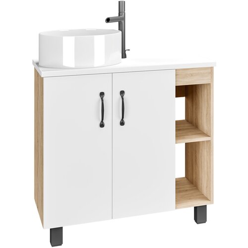 В тумбе Флай 80 см сочетаются контрастные цвета и фактуры: серый матовый фасад с покрытием SoftTouch, корпус цвета дуба с текстурой, черная матовая фурнитура. Открытые полки справа обеспечивают быстрый доступ к аксессуарам, а пространство за распашными дверцами, снабженной системой плавного закрывания, станет удобным местом для хранения бытовых принадлежностей. Корпус тумбы выполнен из ЛДСП, фасад - из МДФ в матовой пленке, перепадам температур и высокой влажности. Черная металлическая ручка и 4 ножки (2 декоративных черных и 2 пластиковых) идут в комплекте с тумбой.