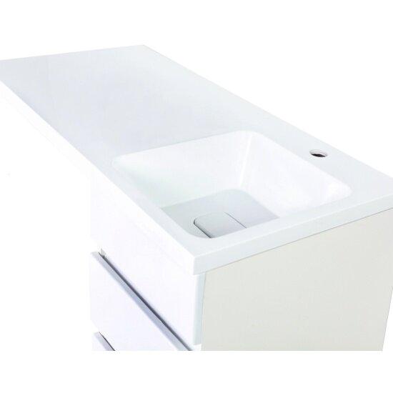 Orange OPTIMA OP-40TUW+RAR Тумба напольная с правой раковиной под стиральную машину. Предназначена для использования в ванных комнатах с повышенной влажностью. Тумба укомплектована выдвижным ящиком, также для хранения предусмотрен нижний отсек с дверцей. Фасад - МДФ в цвете белый глянец, покрытие пленка ПВХ. Корпус - ЛДСП в цвете белый глянец. Раковина с одним отверстием под смеситель (материал - искусственный камень). В комплекте ножки подпятники 4 шт (регулировка по высоте до 10 мм) и кронштейн для крепления крыла раковины.