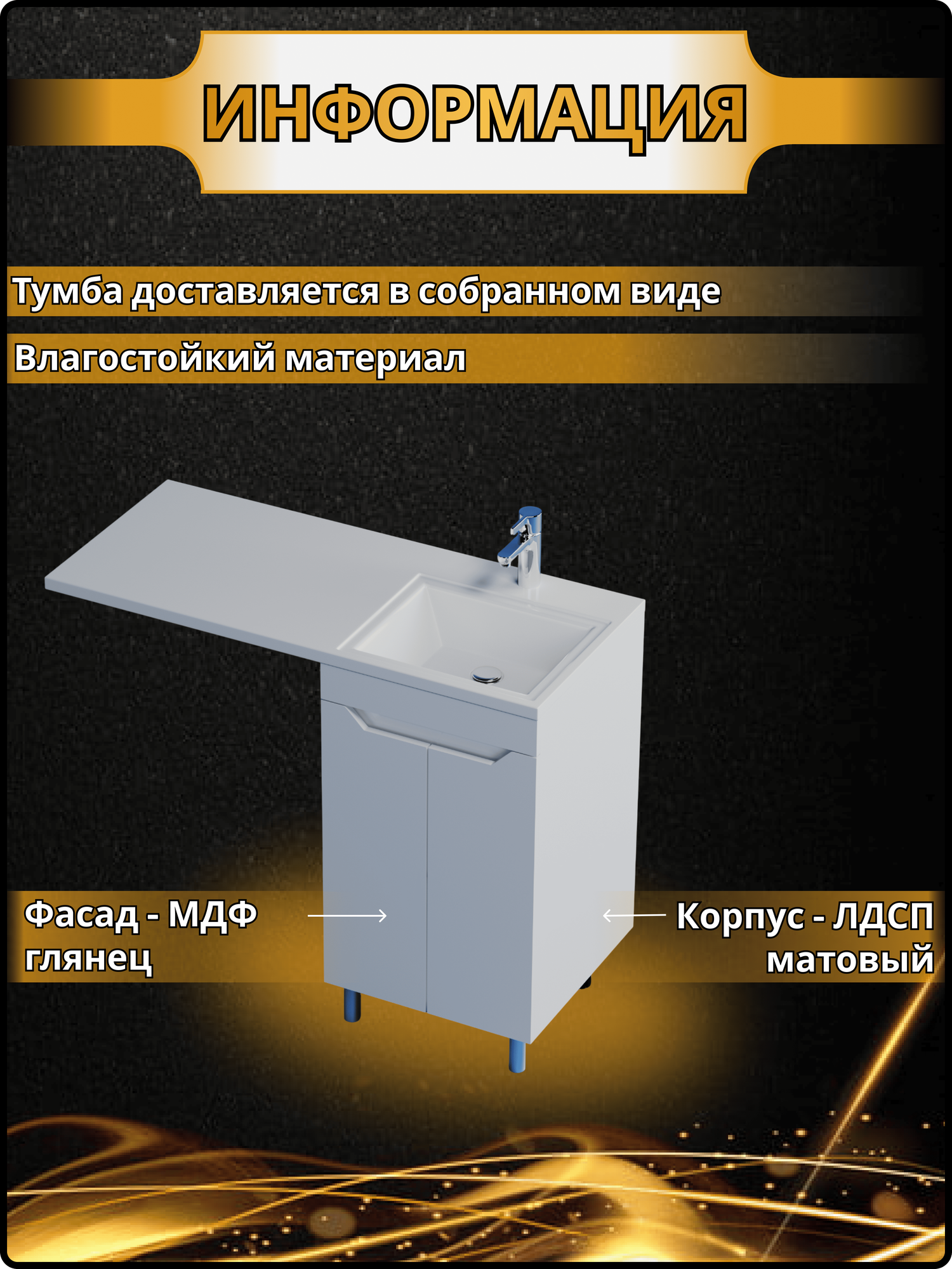 Тумба напольная, что обеспечивает устойчивость и надежность конструкции. Корпус и фасад изготовлены из качественных материалов - ЛДСП и МДФ соответственно. Ламинат и пленка, используемые для покрытия, обеспечивают долговечность и простоту ухода за мебелью.