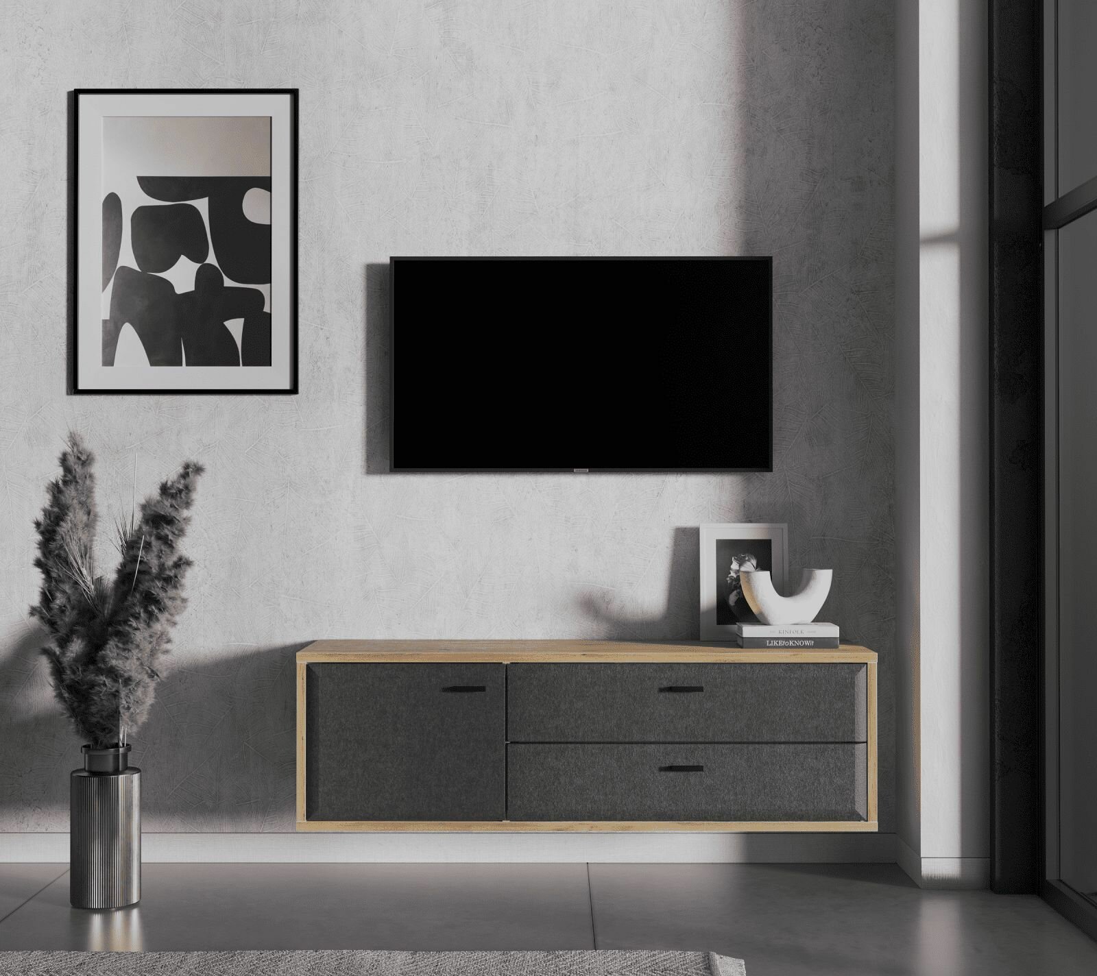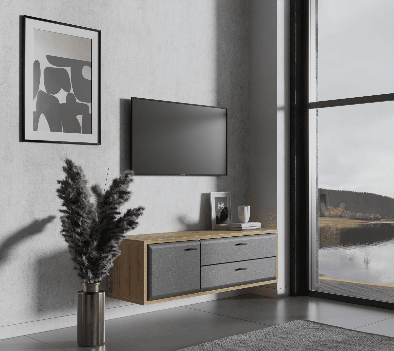 Тумба под ТВ навесная Grace RTV1D2S, дуб наварра/графит, с ящиками и полкой