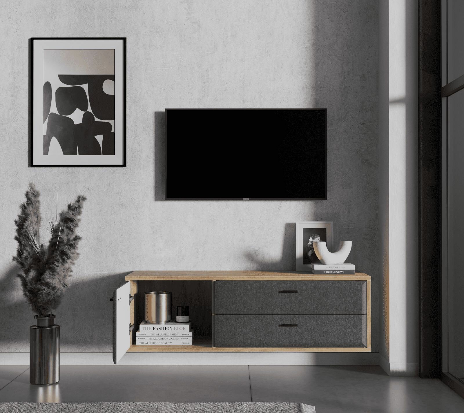 Тумба под ТВ навесная Grace RTV1D2S, дуб наварра/графит, с ящиками и полкой: сравнение цен, характеристики, фото, актуальное наличие и цены.
