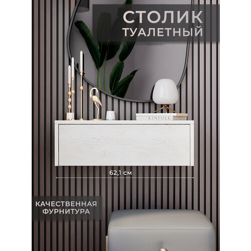 Столик туалетный дуб крафт белый. Данная тумбочка самая функциональная мебель в комнате. Тумба подвесная, из нашего ассортимента, это и столик для макияжа и столик в прихожую в одном предмете. Стол туалетный подойдет для дома, для салона красоты, студии или парикмахерской. Гармонично дополнит любой интерьер и придаст новое слово в стиле. Подвесная консоль универсальна для любых целей, используйте её как дамский столик или как прикроватная тумбочка. Имеет очень вместительный выдвижной ящик, с плавно ходящими направляющими (200 мм), что позволяет не создавать шума при открытии и закрытии, хранить одежду или объёмные вещи. Рабочие размеры модели: сам столик ВхШхГ = 20,2 см х 62,1 см х 30,1 см. Размеры ящика ВхШхГ = 10 см. х 52 см. х 23,5 см. Удобный косметический столик для хранения духов, косметики, женских аксессуаров и создания макияжа, так что, приобретая макияжный столик Вы можете сделать отличный подарок маме, жене, бабушке, дочке. Размещая как мебель для детской комнаты, тумбочка белая, может служить как подставка под ночник или будильник. Туалетный столик трюмо применима как тумба в коридор или тумба в прихожую. Можно использовать под зеркалом, что будет смотреться в парикмахерских и барбершопах, т. к. на туалетный столик консоль легко сложить все необходимые аксессуары для работы. Этот вид мебели всё больше и больше приобретает популярность как среди домашнего, так и коммерческого пользования. Благодаря своей конструкции консоль мебельная освобождает напольное пространство, и не скапливает под собой пыль, упрощая при этом уборку. Подвесная тумба изготовлена из лдсп класса е1 и полностью безопасна и экологична. В комплекте есть весь необходимый фурнитур для сборки и инструкция. Наша команда с трепетом относится к нашим клиентам и следит за качеством продукции. Перейдя в магазин «Философия уюта» вы найдете еще больше разнообразной мебели: настенная полка, стеллаж для книг и игрушек, этажерка, органайзер и многое другое в разных цветах! Философия уюта, уют который доступен каждому!