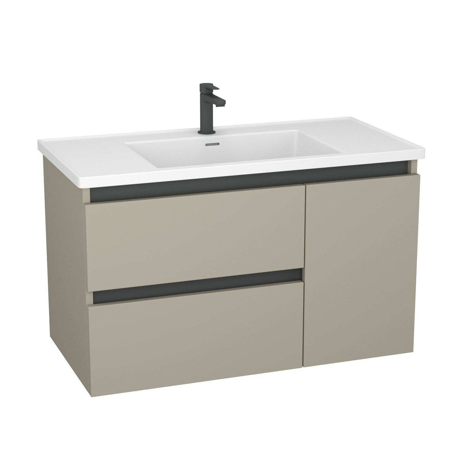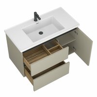Тумба для ванной комнаты подвесная, 2 выдвижных ящика со встроенным доводчиком плавного закрывания скрытого монтажа, 1 дверка плавное закрывание, внутренняя отделка цвет зебрано, умывальник (керамика) в комплекте. Корпус влдсп 16 мм, фасад МДФ 19 мм, покрытие фасада эмаль глянец.