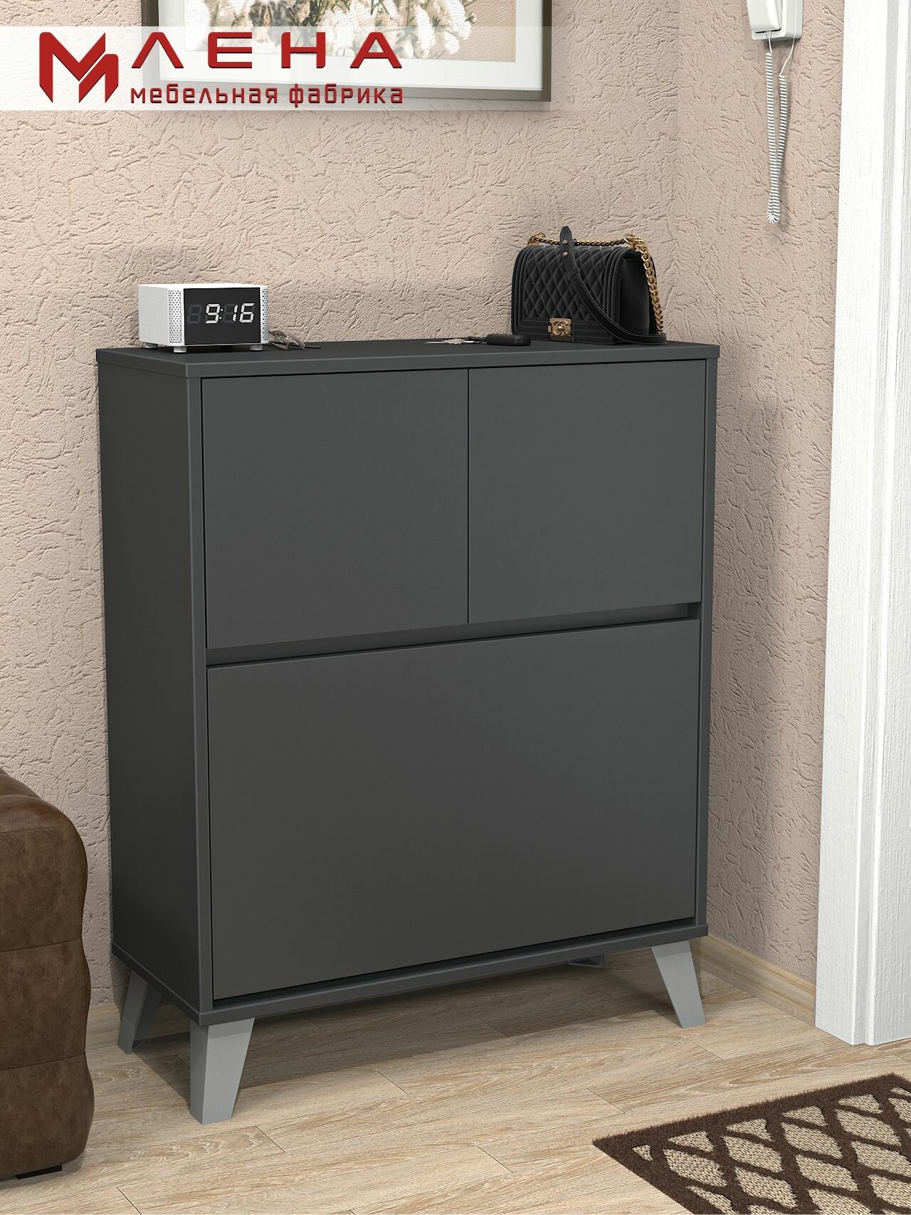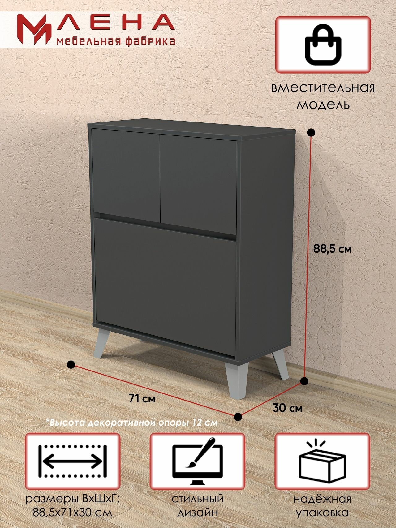 Тумба для обуви №30 от Мебельной фабрики лена представляет собой функциональное и стильное решение для хранения обуви в гостиной или прихожей. Цвет Антрацит находится в более темной части серой палитры. Он является доминирующим и имеет металлический блеск, который придает ему вид черный, но одновременно переходящего в серый. Помимо создания контраста, этот строгий нейтральный декор отлично смотрится в сочетании с текстурой дерева и репродукциями других материалов. Эта тумба под обувь обладает тремя дверями и четырьмя полками, что обеспечивает достаточное пространство для размещения различных видов обуви. Изготовленная из надежного ЛДСП, тумба не только прочная, но и легко поддается сборке, что делает ее удобной в использовании. Закрытый фасад обеспечивает эстетичность и сохранность обуви от пыли. Этот продукт отличается высоким качеством и долговечностью, станет отличным дополнением к интерьеру вашего дома.