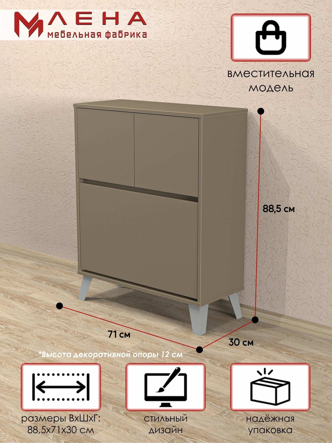Тумба для обуви №30 от Мебельной фабрики лена представляет собой функциональное и стильное решение для хранения обуви в гостиной или прихожей. Цвет Латте - это нейтральный темно-бежевый декор с землистым оттенком, который обязательно добавит ощущение уюта в любой интерьер. Он предназначен для того, чтобы подчеркивать, дополнять все виды древесины - от бука до ореха. Он не просто захватывающий для взора. Он дает поистине тактильные ощущения. Эта тумба под обувь обладает тремя дверями и четырьмя полками, что обеспечивает достаточное пространство для размещения различных видов обуви. Изготовленная из надежного ЛДСП, тумба не только прочная, но и легко поддается сборке, что делает ее удобной в использовании. Закрытый фасад обеспечивает эстетичность и сохранность обуви от пыли. Этот продукт отличается высоким качеством и долговечностью, станет отличным дополнением к интерьеру вашего дома.