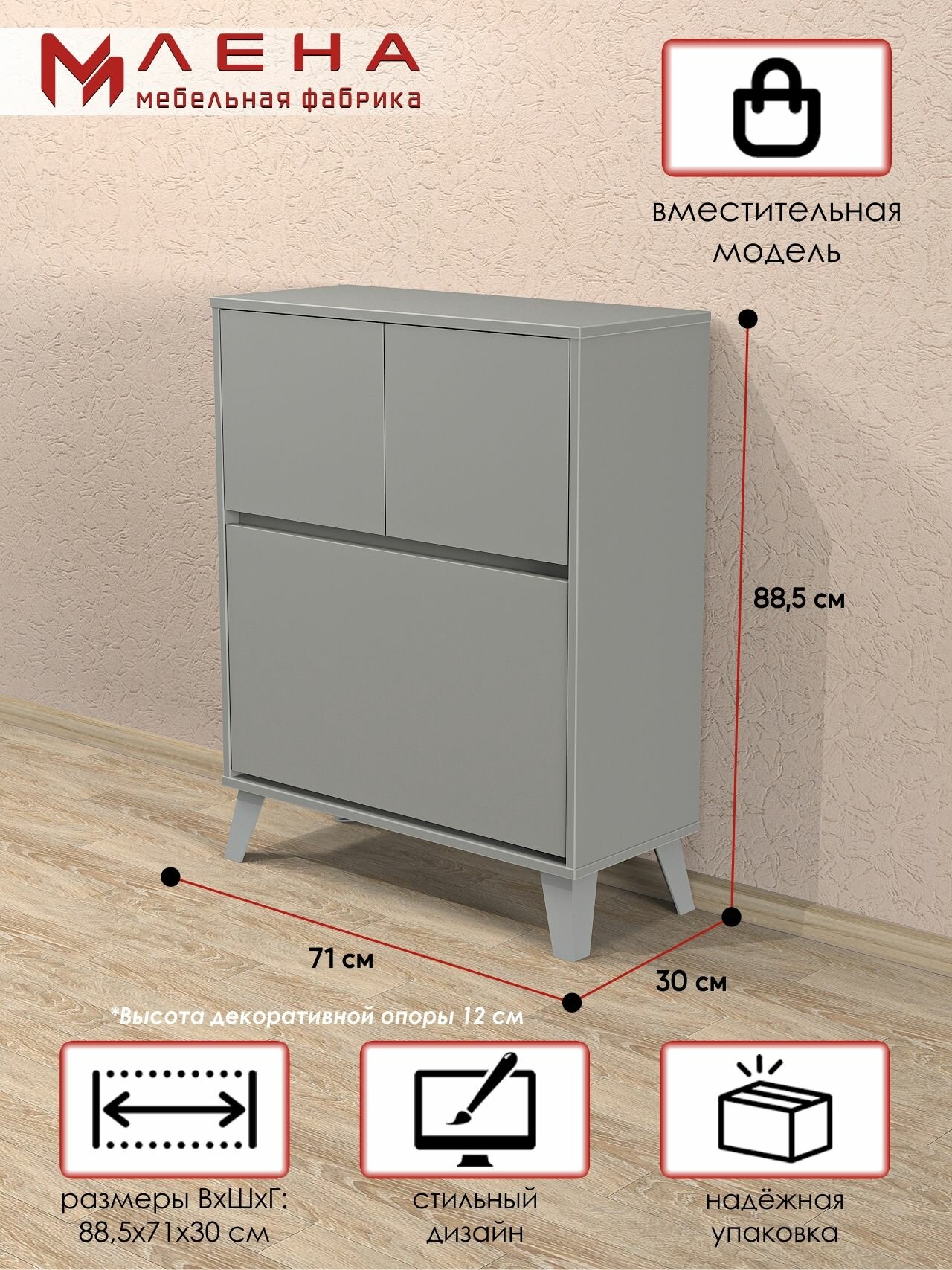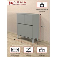 Тумба для обуви №30 от Мебельной фабрики лена представляет собой функциональное и стильное решение для хранения обуви в гостиной или прихожей. Цвет Серый - это декор холодного серого цвета, придающий нейтральность и допускающий множество сочетаний. Он напоминает цвет шифера с легким оттенком лазури и отлично смотрится в сочетании с текстурами под дерево. Эта тумба под обувь обладает тремя дверями и четырьмя полками, что обеспечивает достаточное пространство для размещения различных видов обуви. Изготовленная из надежного ЛДСП, тумба не только прочная, но и легко поддается сборке, что делает ее удобной в использовании. Закрытый фасад обеспечивает эстетичность и сохранность обуви от пыли. Этот продукт отличается высоким качеством и долговечностью, станет отличным дополнением к интерьеру вашего дома.