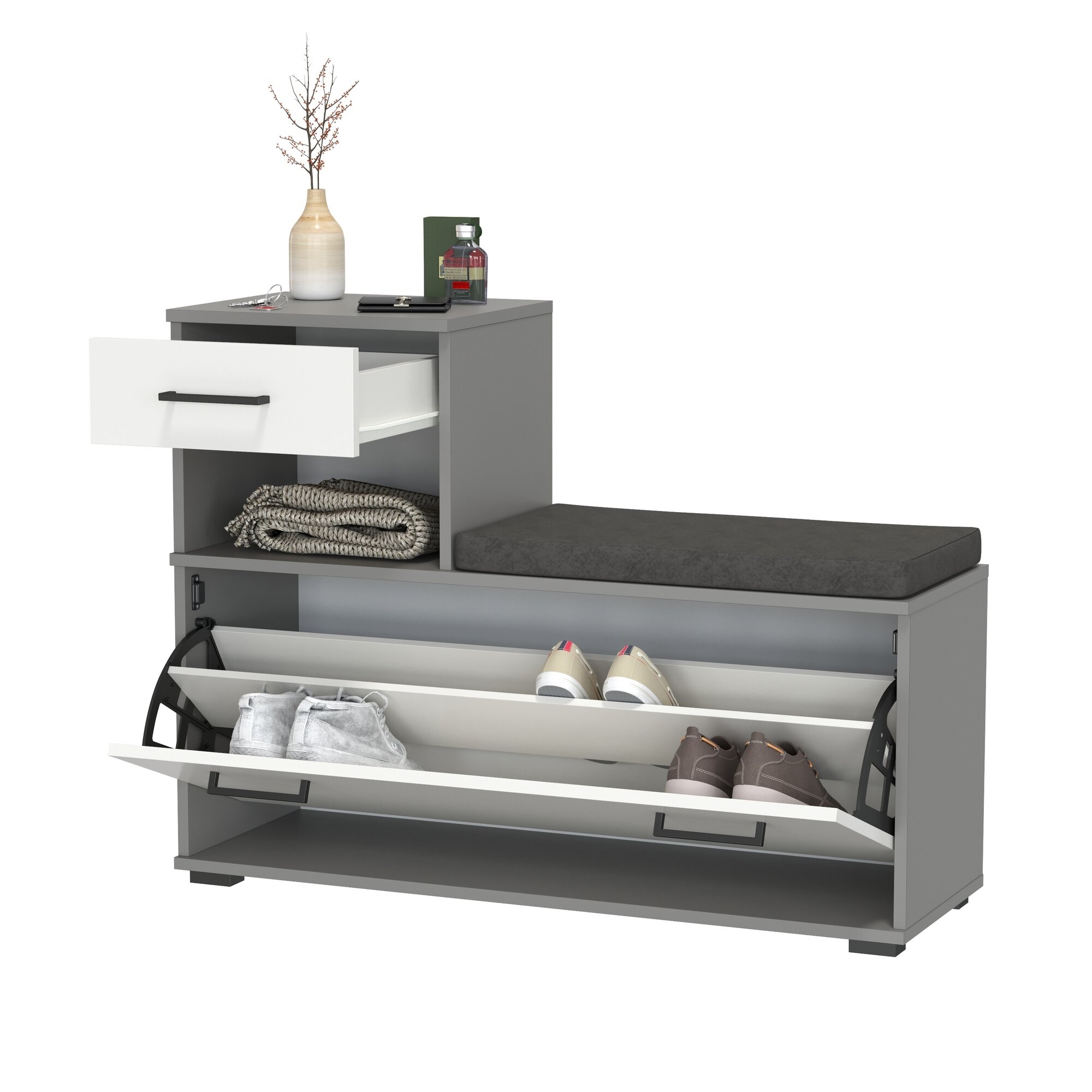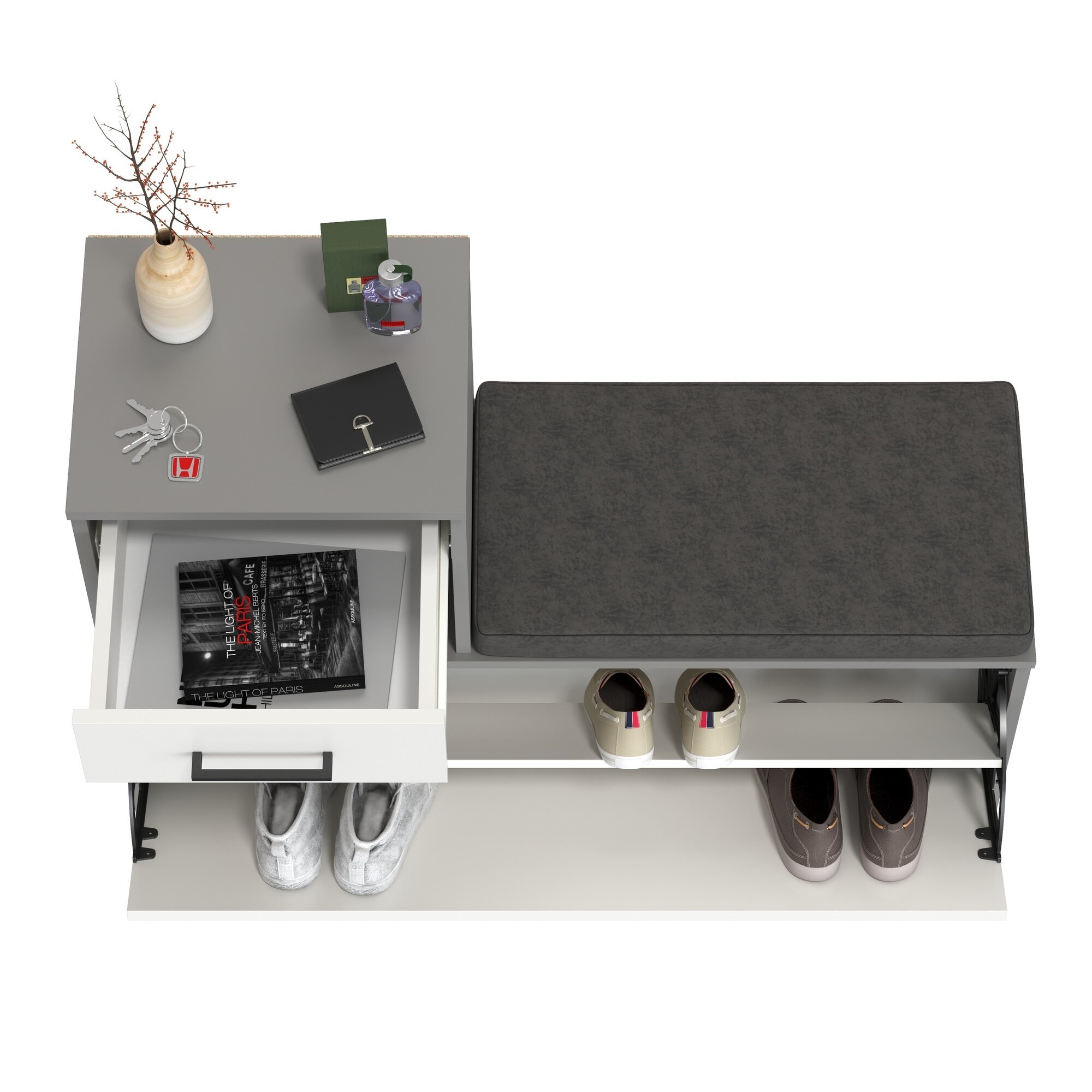 Обувница, за удобной откидной дверкой, разместит до восьми пар сезонной обуви - достаточная вместимость для семьи с детками.