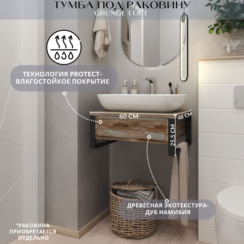 Тумба 1Marka GRUNGE LOFT 60П 1в. я Дуб Намибия Ц0000001579 в стиле лофт, покупка которой решает сразу несколько важных вопросов в функциональном оформлении ванной комнаты. Ее дизайн построен на гармоничном сочетании дерева и металла: корпус с естественной фактурой дерева дополнен металлическими кронштейнами, которые также могут использоваться в качестве рейлов для размещения полотенец и халатов.