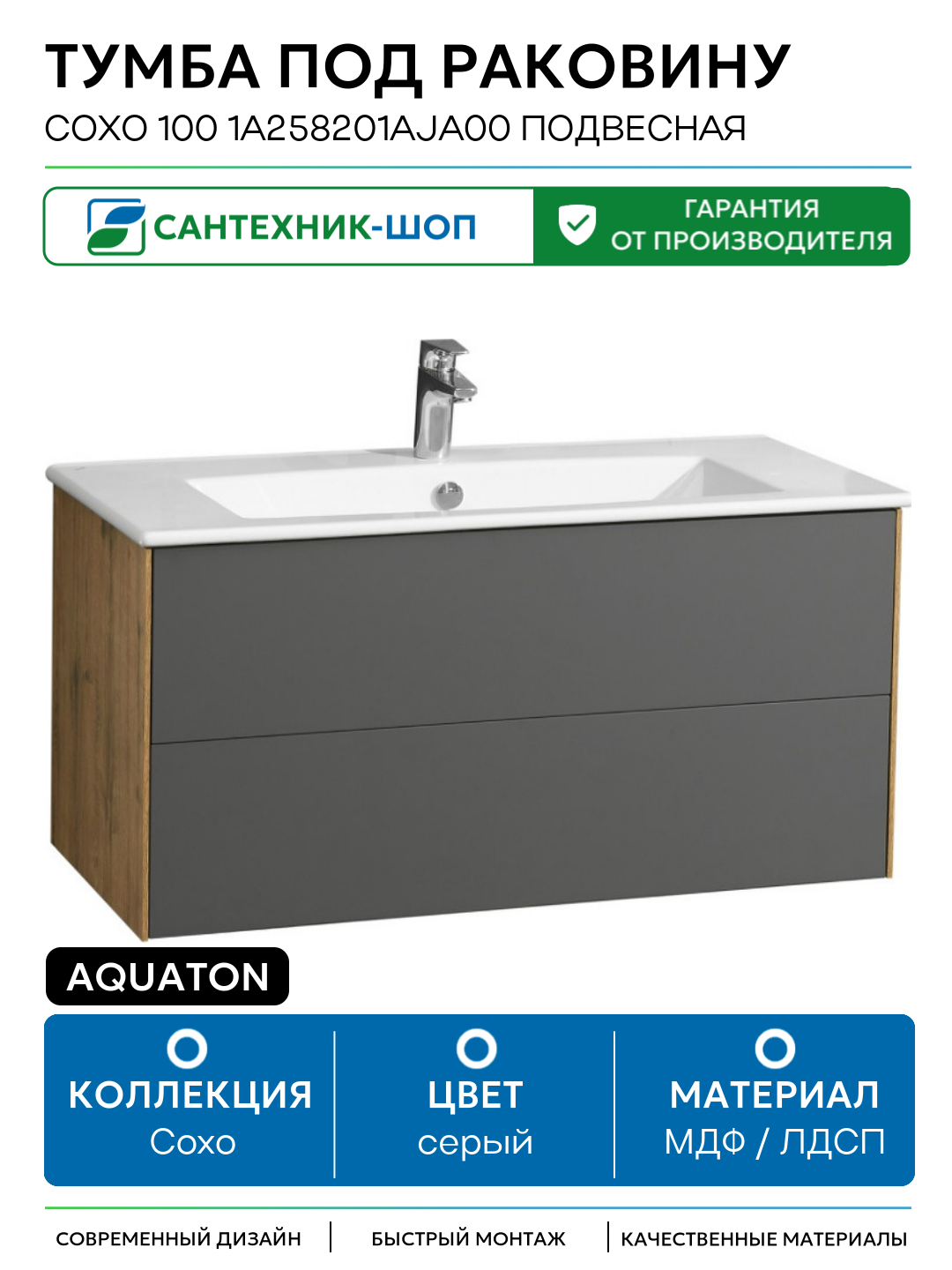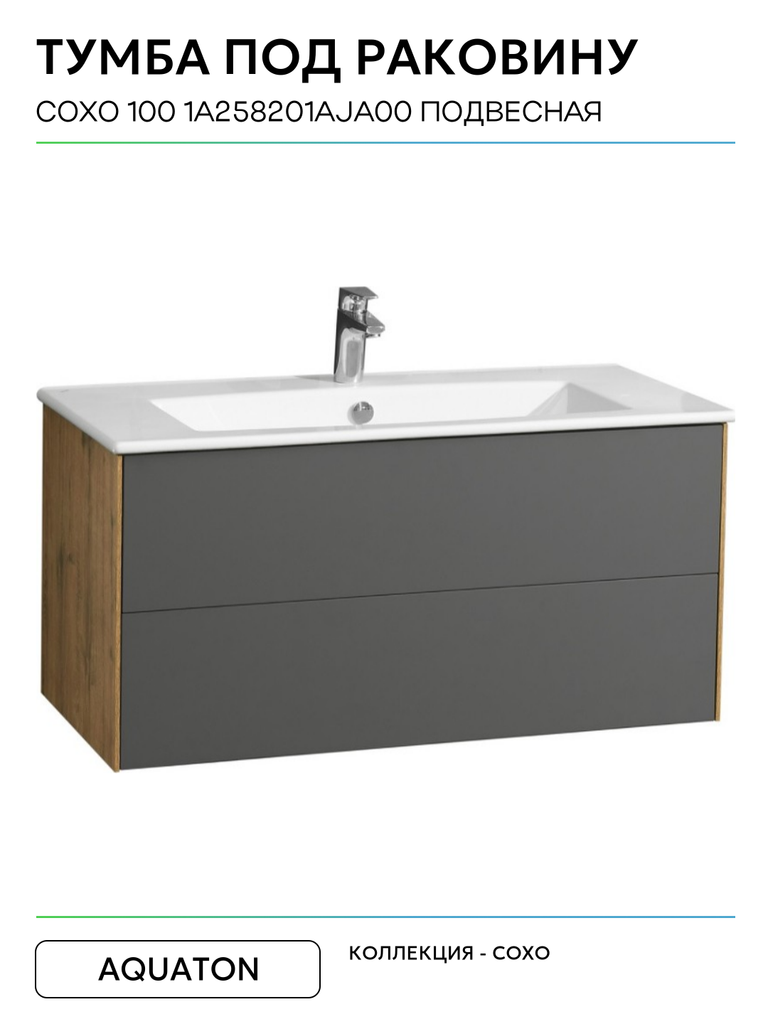 Тумба под раковину - превосходное решение для современного оснащения ванной комнаты. Тумба отлично впишется в любой интерьер ванной комнаты. Универсальный дизайн тумбы позволит вам без проблем организовать дополнительное место для хранения в ванной комнате. Благодаря лаконичным линиям и уместным цветам, тумба идеально впишется в интерьер, будет прекрасно сочетаться с любым дизайном плитки. Тумба Сохо 100 функционально состоит из двух вместительных ящиков, оснащенных системой push to open, обеспечивающей надежное, комфортное и бесшумное закрывание. Фасады изделия выполнены из МДФ в пленке графит с эффектом soft touch, корпус из ламинированной влагостойкой ДСП Дуб веллингтон. Верхний и нижний ящики оснащены системой организации пространства, которая позволяет содержать косметические средства в идеальном порядке. Дополняет тумбу стильная раковина Элина от бренда Santek с удобной чашей. Все внутренние детали тумбы выполнены в тон фасадов - цвета антрацит. Тумба в ванную послужит отличным подарок маме, сестре, папе, бабушке, подруге на Новый Год, 8 марта, 14 февраля, День Рождения, Рождество. Наши преимущества: экономия места и пространства, комфортное использование, соотношение цены и качества. Раковина НЕ идет В комплекте! Нас находят по запросам: комоды и тумбы, тумбы, тумбы под раковину, тумбы в ванную комнату, тумбы в ванную, тумбы для ванной, подвесные тумбы, тумба, тумба под раковину, тумба в ванную, тумба для ванной, тумба под раковину в ванную, тумба подвесная, подвесная тумба, тумба навесная, тумба в ванну.