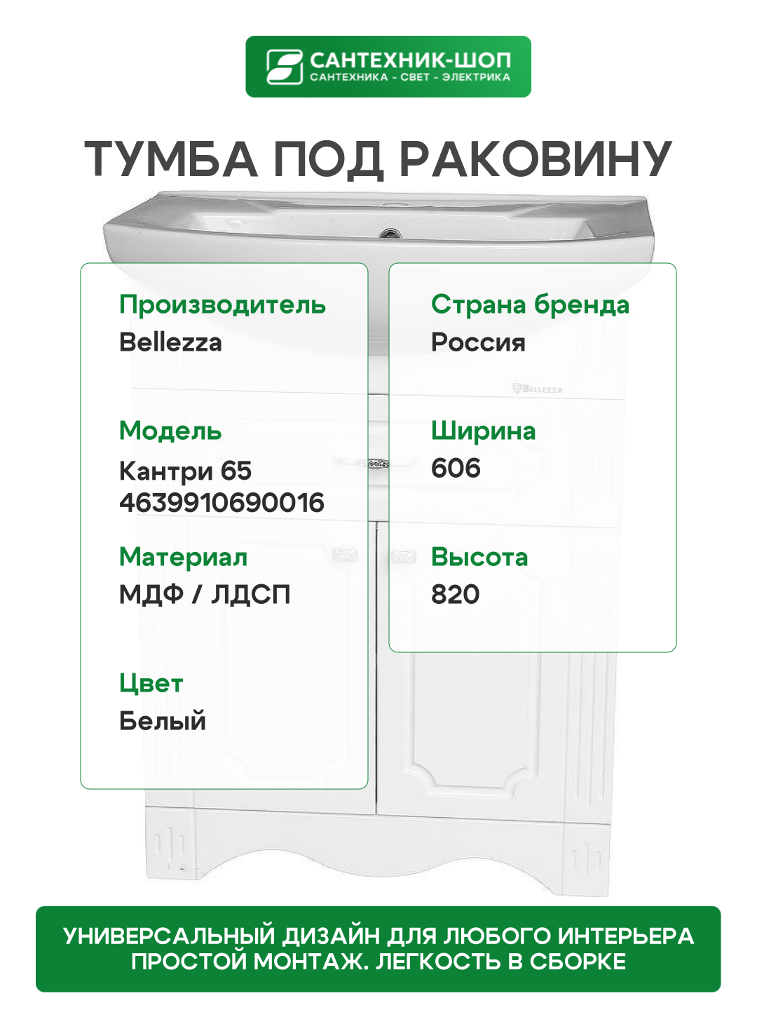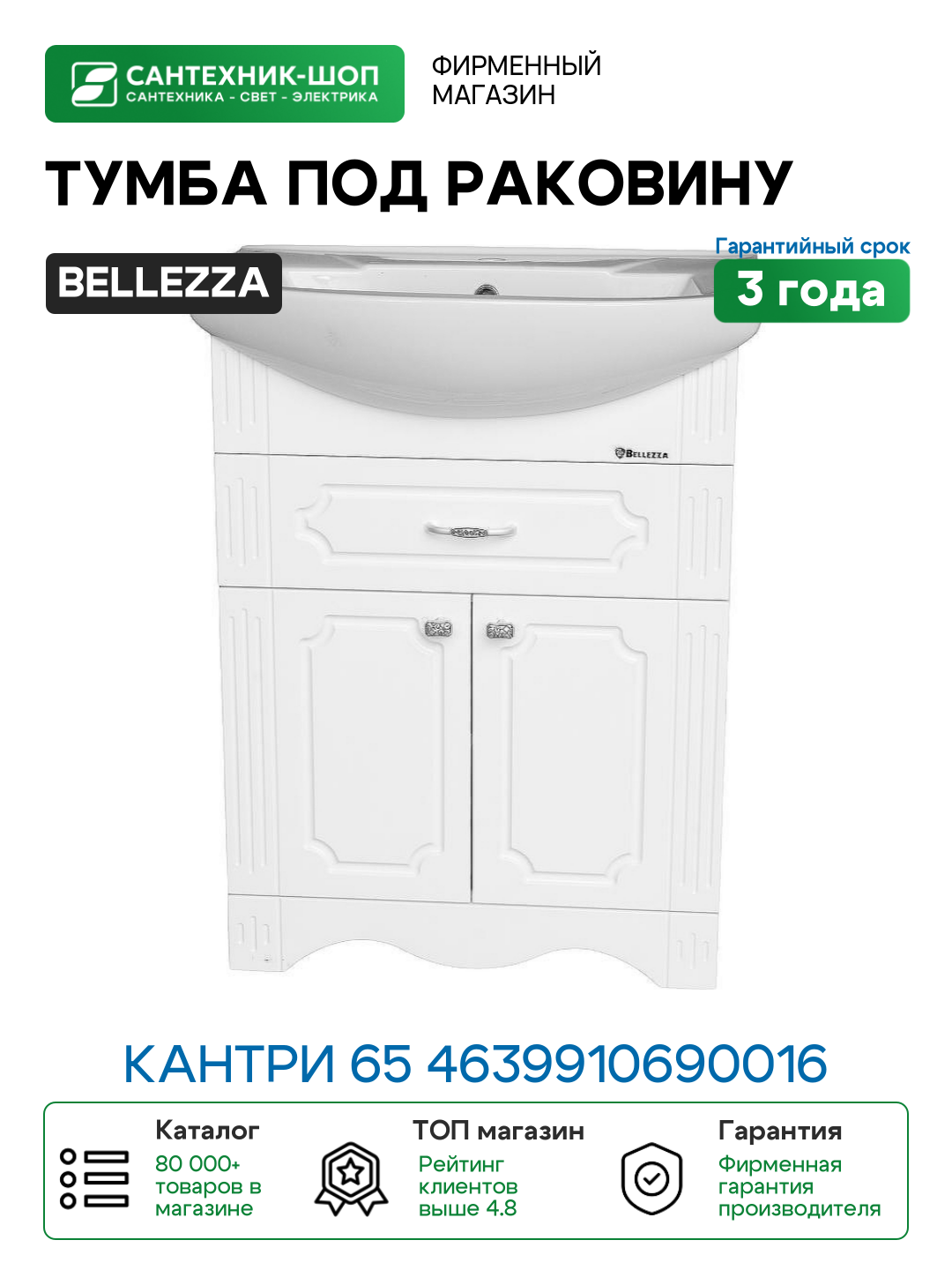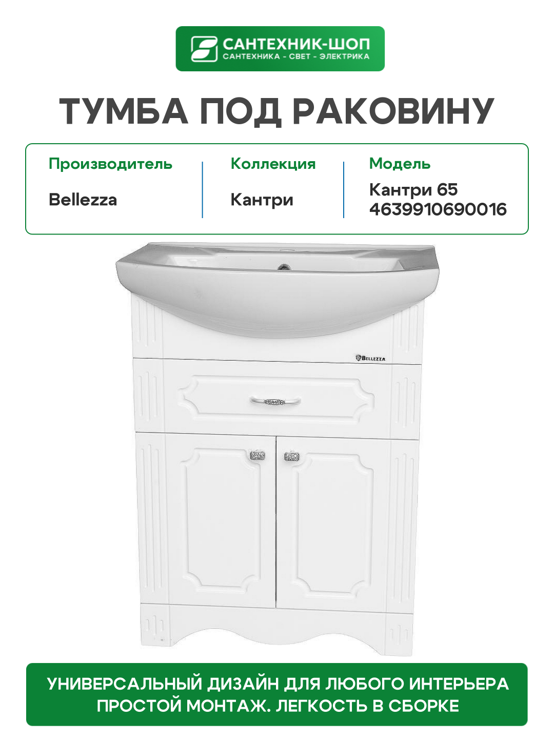 Купить Тумба под раковину Bellezza Кантри 65 4639910690016 Белая МДФ / ЛДСП с доставкой по всей России.