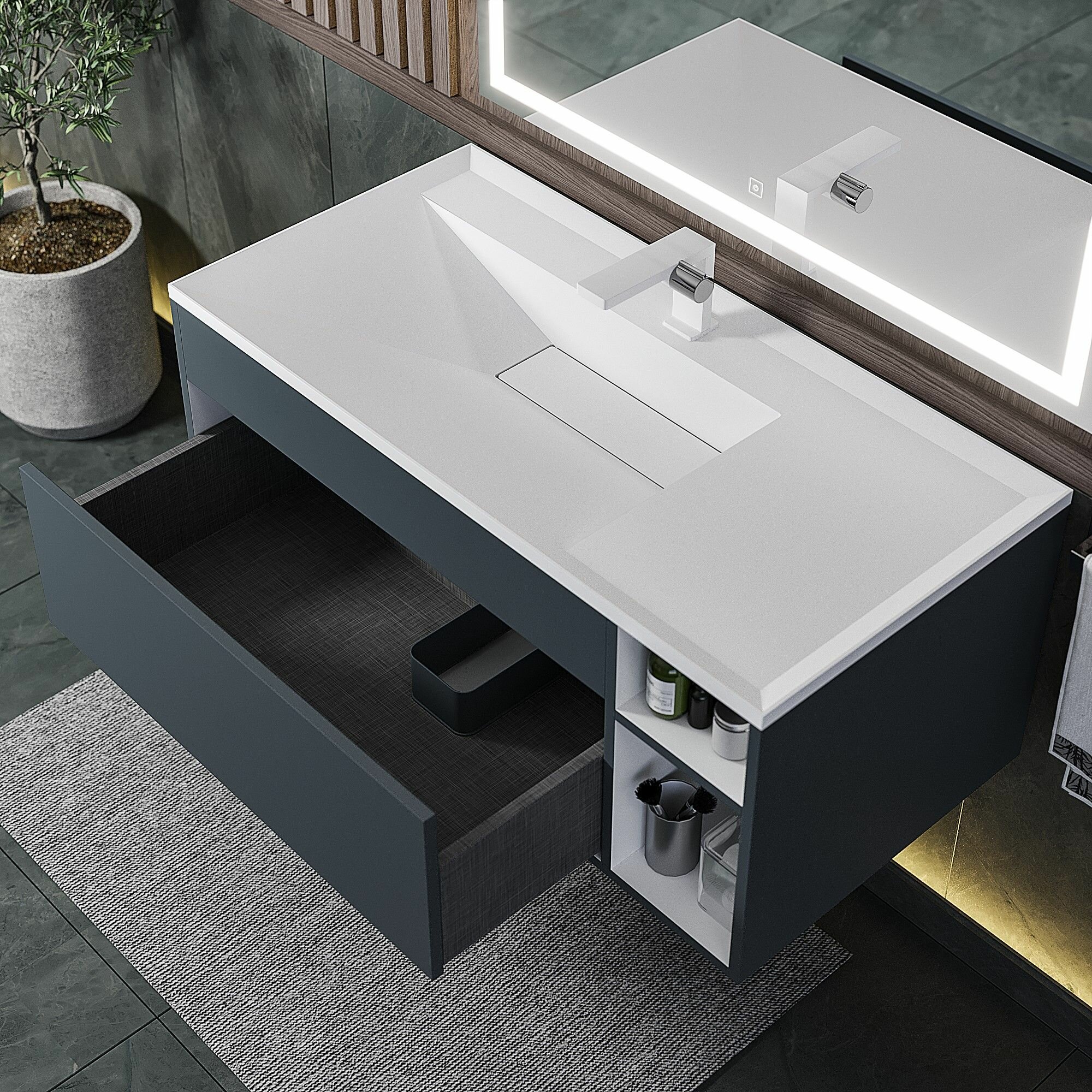 Подвесная тумба для ванной комнаты с выдвижным ящиком от бренда Uperwood из коллекции Lotus шириной 99,6 см подходит под раковину Uperwood Lotus шириной 100 см и представляет собой функциональное, надежное и практичное решение, которое отлично впишется в любой современный дизайн ванной комнаты.