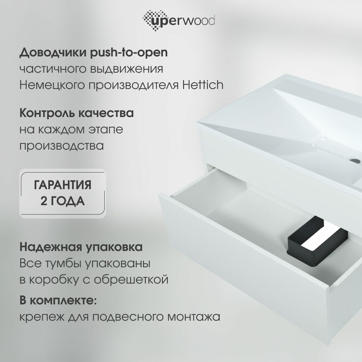 Подвесная тумба для ванной комнаты с выдвижным ящиком от бренда Uperwood из коллекции Lotus шириной 79,6 см подходит под раковину Uperwood Lotus шириной 80 см и представляет собой функциональное, надежное и практичное решение, которое отлично впишется в любой современный дизайн ванной комнаты.