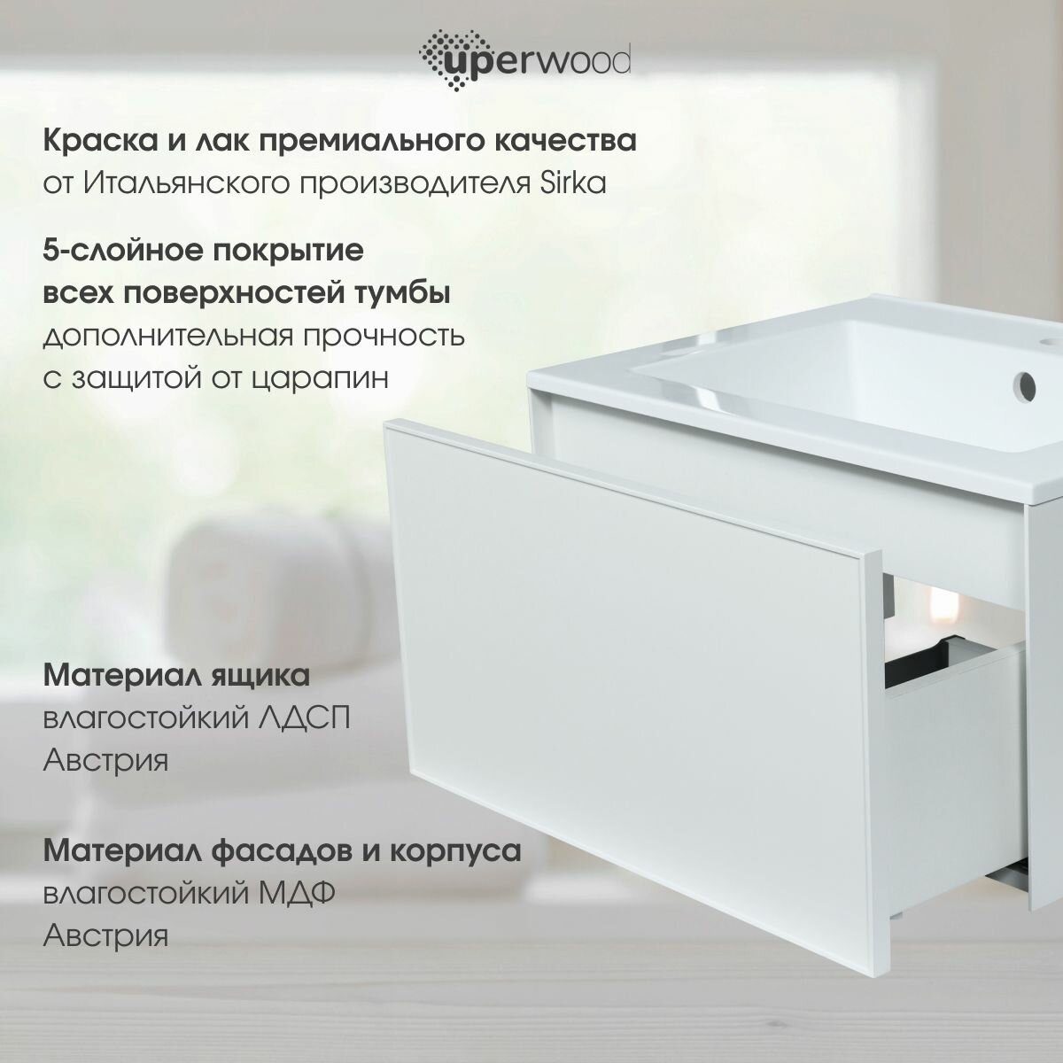Выдвижной ящик изготовлен из влагостойкой ЛДСП. МДФ и влдсп производство Egger (Австрия).