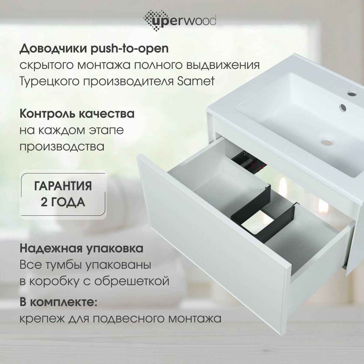 Ящик оснащен доводчиками Samet (Турция), пуш скрытого монтажа полного выдвижения.