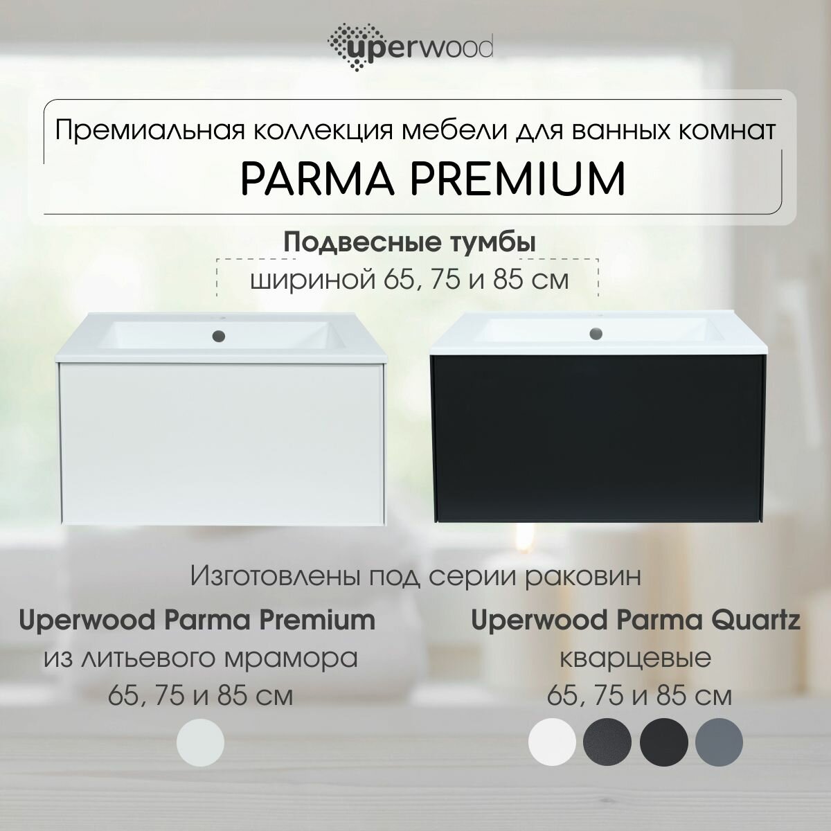 Тумбы Parma Premium изготовлены под серию раковин из литьевого мрамора Uperwood Parma Premium и кварцевых раковин Uperwood Parma Quartz соответствующих размеров от 65 до 85 см.
