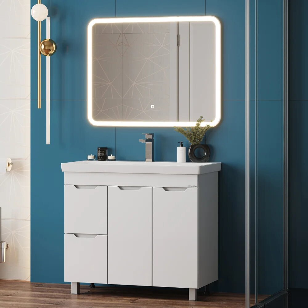 Цвет: белый, Название цвета: белый, Покрытие: глянцевая, Ширина, см: 86, Глубина, см: 43, Высота, см: 78, Монтаж: напольный, Бельевая корзина: есть, Стилистика дизайна: минимализм, Механизм доводчика: да, Покрытие корпуса: матовое, Система хранения: бельевая корзина, с дверками, с ящиками, Покрытие фасада: пленка, Материал раковины: фарфор, Материал корпуса: ЛДСП, Материал фасада: лМДФ, Оснащение: механизм доводчика, Расположение петель: слева, Вес, кг: 32.1. Состав комплекта: Тумба - 1 шт. Раковина - 1 шт. Зеркало - 1 шт.