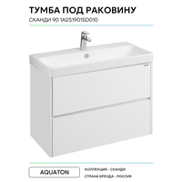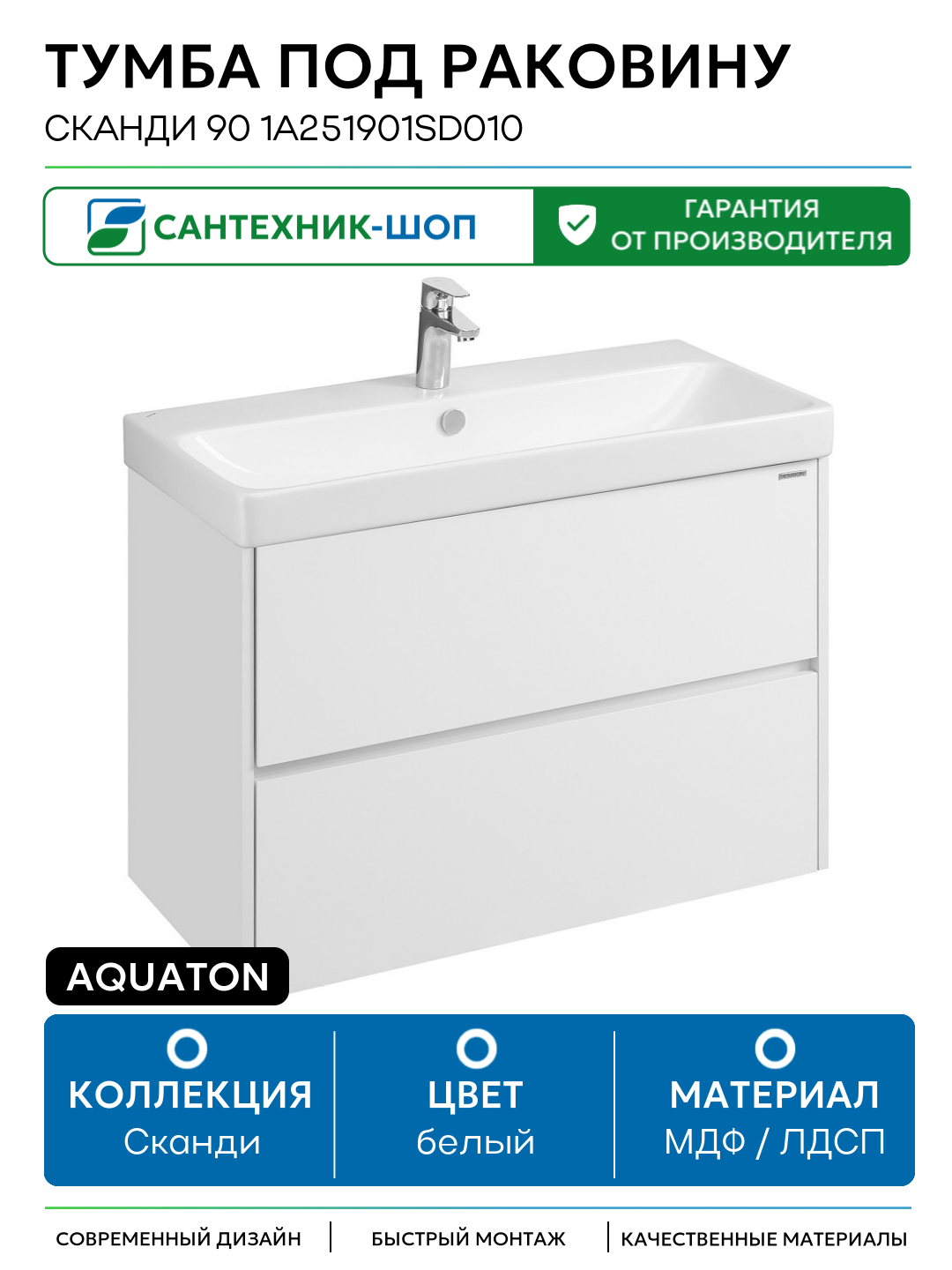 Тумба под раковину Aquaton Сканди 90 1A251901SD010 выполнена в популярном минималистичном скандинавском стиле. Корпус тумбы для ванной выполнен из влагостойкой ЛДСП в белой матовой покраске, а фасады в белой глянцевой покраске. Конструктивно тумба состоит из 2 вместительных ящиков, установленных на направляющие с интегрированной системой push-to-open (нажми и открой) для комфортного использования. На тумбе нет выступающих деталей и фурнитуры, открытие ящиков реализовано нажатием на фасад. Тумбу по желанию можно использовать в двух вариантах: как подвесную или дополнительно приобрести опоры