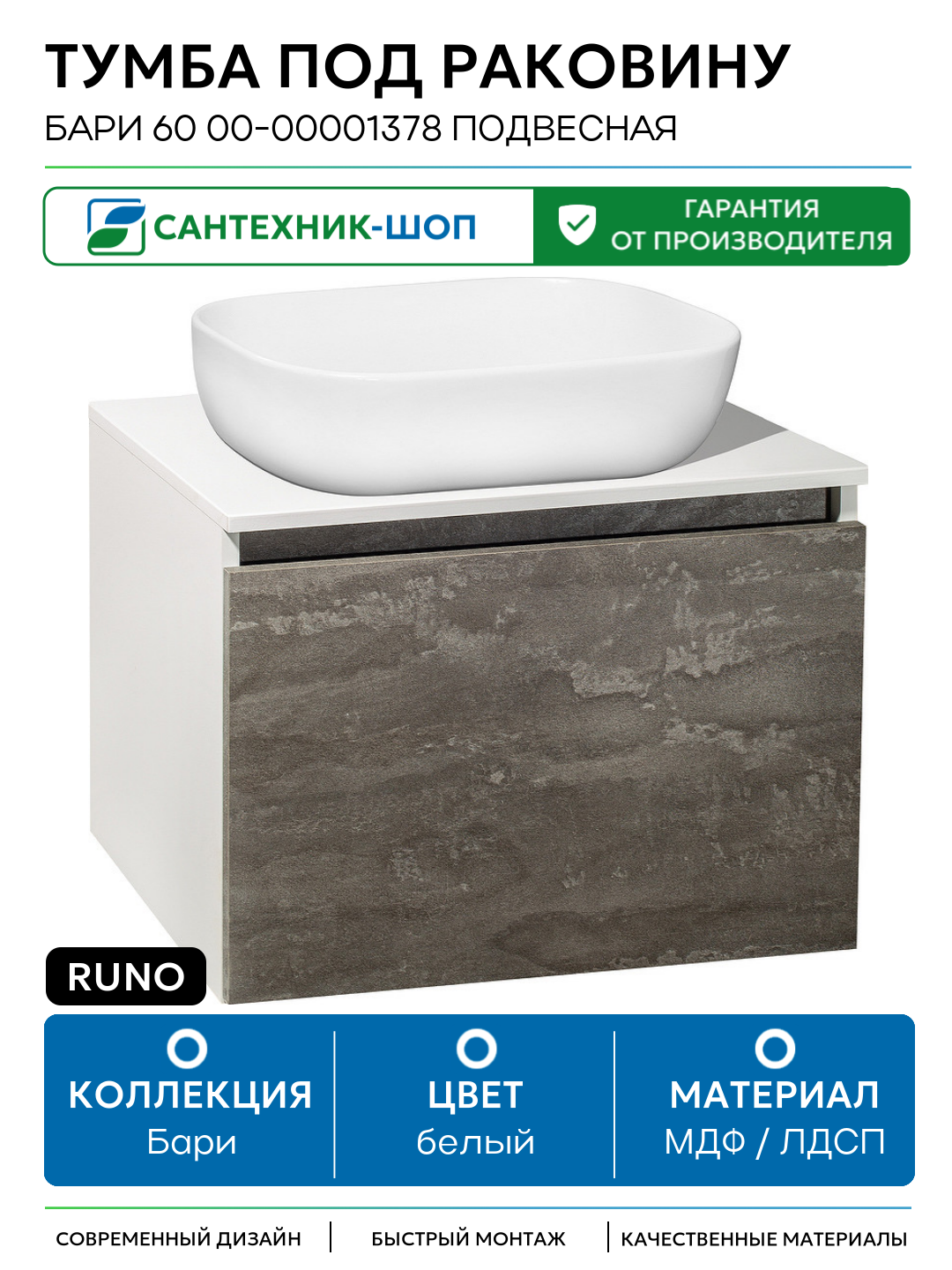 Тумба под раковину Runo Бари 60 00-00001378 подвесная Железный камень Белая МДФ / ЛДСП белый с ящиками Россия: сравнение цен, характеристики, фото, актуальное наличие и цены.